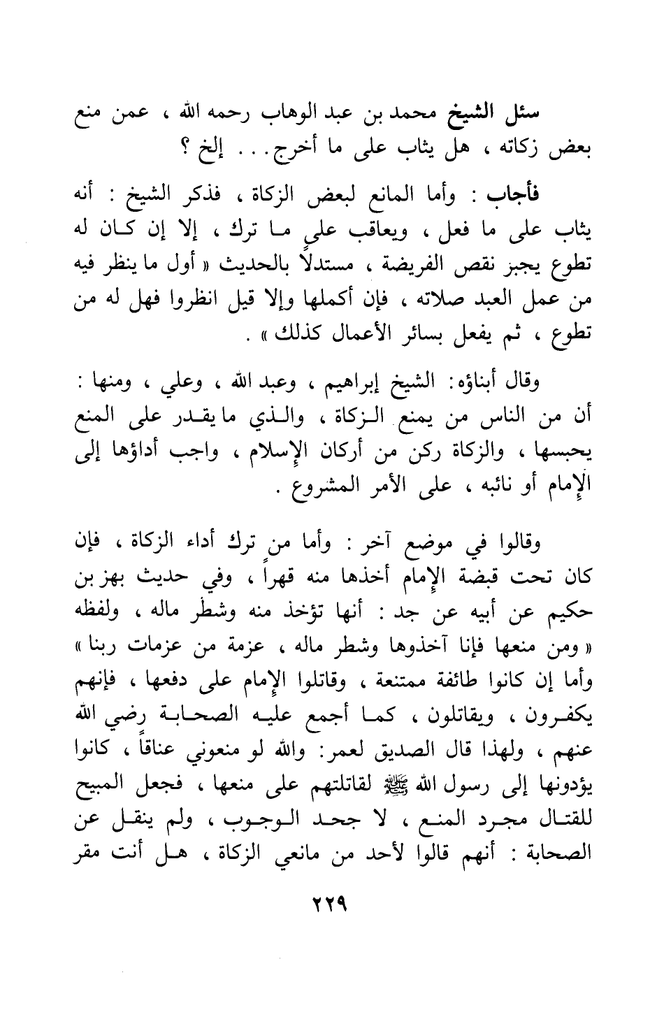 وقال أبناؤه: الشيخ إبراهيم، وعبد الله، وعلي: ومنها: أن من الناس من يمنع الزكاة، والذي ما يقدر على المنع يحبسها؛ والزكاة ركن من أركان الإسلام، واجب أداؤها إلى الإمام أو نائبه، على الأمر المشروع.