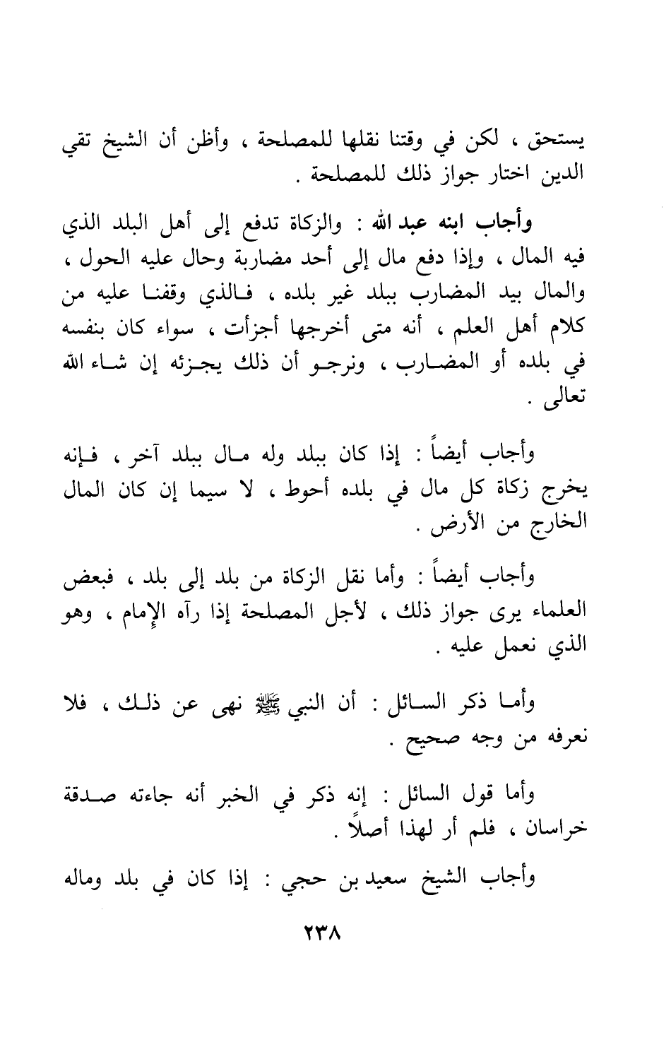 وأجاب أيضاً: وأما نقل الزكاة من بلد إلى بلد، فبعض العلماء يرى جواز ذلك، لأجل المصلحة إذا رآه الإمام؛ وهو الذي نعمل عليه. وأما ذكر السائل: أن النبي صلى الله عليه وسلم نهى عن ذلك، فلا نعرفه من وجه صحيح. وأما قول السائل: إنه ذكر في الخبر أنه جاءته صدقة خراسان، فلم أر لهذا أصلاً.