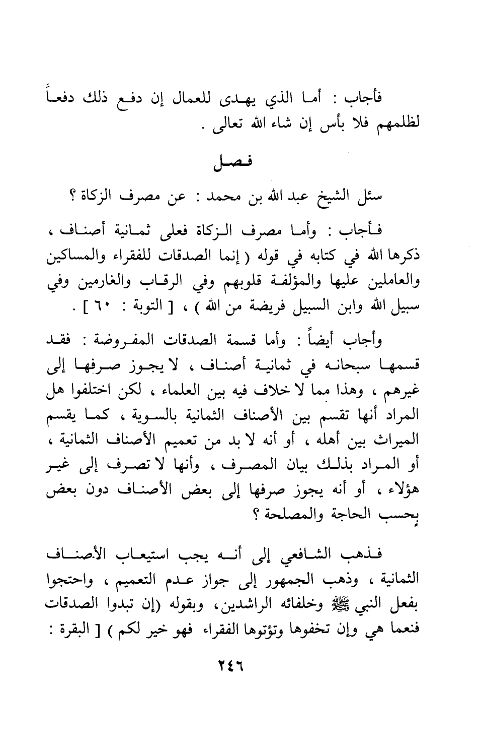 فأجاب: وأما مصرف الزكاة، فعلى ثمانية أصناف: ذكرها الله في كتابه في قوله: {إِنَّمَا الصَّدَقَاتُ لِلْفُقَرَاءِ وَالْمَسَاكِينِ وَالْعَامِلِينَ عَلَيْهَا وَالْمُؤَلَّفَةِ قُلُوبُهُمْ وَفِي الرِّقَابِ وَالْغَارِمِينَ وَفِي سَبِيلِ اللَّهِ} [سورة التوبة آية: 60] .