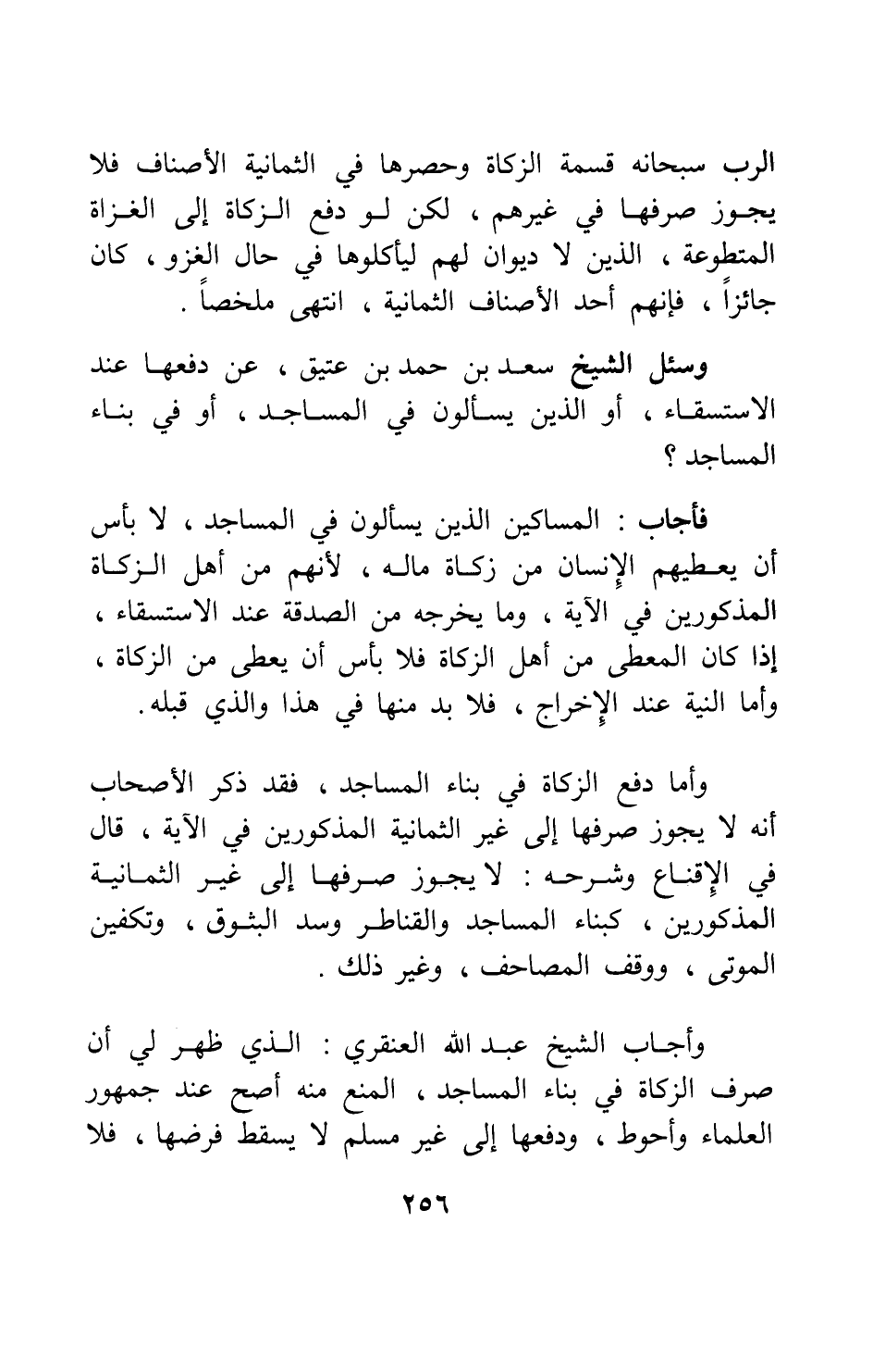 وأجاب الشيخ عبد الله العنقري: الذي ظهر لي أن صرف الزكاة في بناء المساجد، المنع منه أصح عند جمهور العلماء وأحوط. ودفعها إلى غير مسلم لا يسقط فرضها، فلا