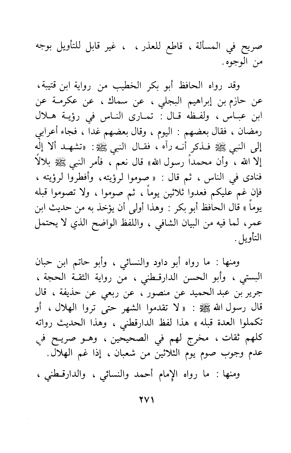 ومنها: ما رواه أبو داود والنسائي، وأبو حاتم ابن حبان البستي، وأبو الحسن الدارقطني، من رواية الثقة الحجة، جرير بن عبد الحميد عن منصور عن ربعي عن حذيفة، قال قال رسول الله صلى الله عليه وسلم: " لا تقدموا الشهر حتى تروا الهلال، أو تكملوا العدة قبله " 1، هذا لفظ الدارقطني؛ وهذا الحديث رواته كلهم ثقات، مخرج لهم في الصحيحين، وهو صريح في عدم وجوب صوم يوم الثلاثين من شعبان، إذا غم الهلال.