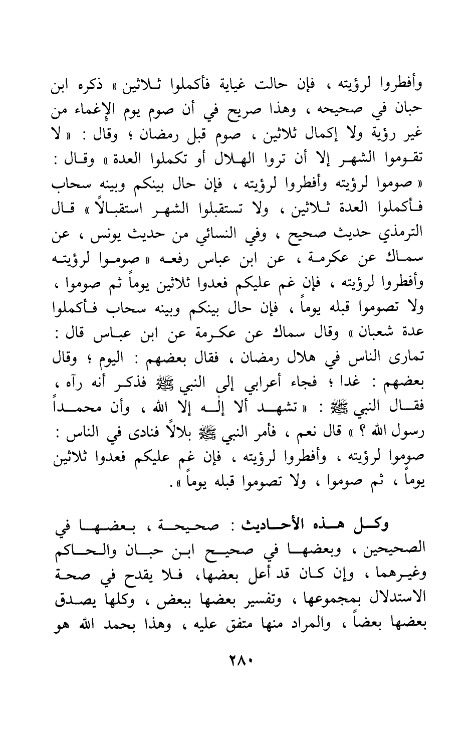 وأفطروا لرؤيته، فإن حالت غياية فأكملوا ثلاثين " 1، ذكره ابن حبان في صحيحه؛ وهذا صريح في أن صوم يوم الإغماء من غير رؤية ولا إكمال ثلاثين، صوم قبل رمضان، وقال: " لا تقدموا الشهر إلا أن تروا الهلال أو تكملوا العدة " 2، وقال: " صوموا لرؤيته وأفطروا لرؤيته، فإن حال بينكم وبينه سحاب فأكملوا العدة ثلاثين، ولا تستقبلوا الشهر استقبالاً " 3، قال الترمذي: حديث صحيح. وفي النسائي من حديث يونس عن سماك عن عكرمة عن ابن عباس رفعه: " صوموا لرؤيته وأفطروا لرؤيته، فإن غم عليكم فعدوا ثلاثين يوماً ثم صوموا. ولا تصوموا قبله يوماً، فإن حال بينكم وبينه سحاب فأكملوا عدة شعبان " 4، وقال سماك عن عكرمة عن ابن عباس قال: " تمارى الناس في هلال رمضان، فقال بعضهم: اليوم، وقال بعضهم: غداً، فجاء أعرابي إلى النبي صلى الله عليه وسلم فذكر أنه رآه، فقال النبي صلى الله عليه وسلم: تشهد ألا إله إلا الله، وأن محمدا رسول الله؟ قال: نعم، فأمر النبي صلى الله عليه وسلم بلالاً فنادى في الناس: صوموا لرؤيته، وأفطروا لرؤيته، فإن غم عليكم فعدوا ثلاثين يوماً، ثم صوموا، ولا تصوموا قبله يوماً ".