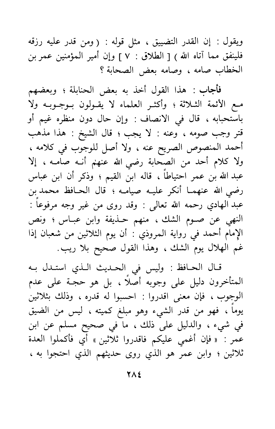 قال الحافظ: وليس في الحديث الذي استدل به المتأخرون دليل على وجوبه أصلاً، بل هو حجة على عدم الوجوب، فإن معنى اقدروا: احسبوا له قدره، وذلك بثلاثين يوماً، فهو من قدر الشيء وهو مبلغ كميته، ليس من الضيق في شيء، والدليل على ذلك، ما في صحيح مسلم عن ابن عمر: " فإن أغمي عليكم، فاقدروا ثلاثين " 1 أي: فأكملوا العدة ثلاثين، وابن عمر هو الذي روى حديثهم الذي احتجوا به