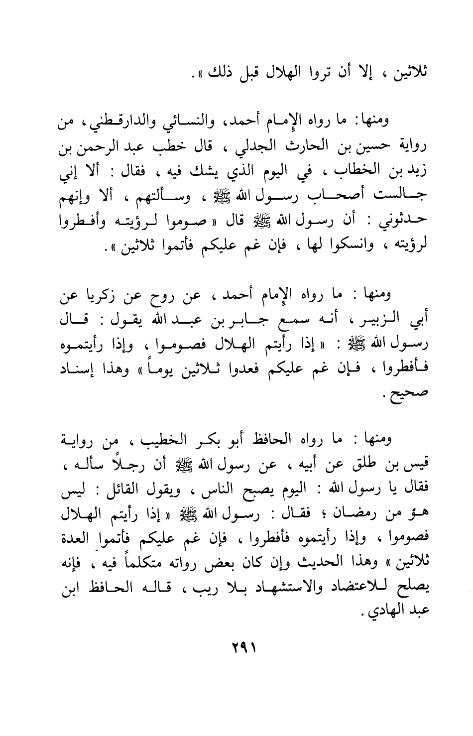 ومنها: ما رواه الإمام أحمد، والنسائي والدارقطني، من رواية حسين بن الحارث الجدلي، قال خطب عبد الرحمن بن زيد بن الخطاب، في اليوم الذي يشك فيه، فقال: ألا إني جالست أصحاب رسول الله صلى الله عليه وسلم وسألتهم، ألا وإنهم حدثوني: أن رسول الله صلى الله عليه وسلم قال: " صوموا لرؤيته وأفطروا لرؤيته، وانسكوا لها، فإن غم عليكم فأتموا ثلاثين " 2.