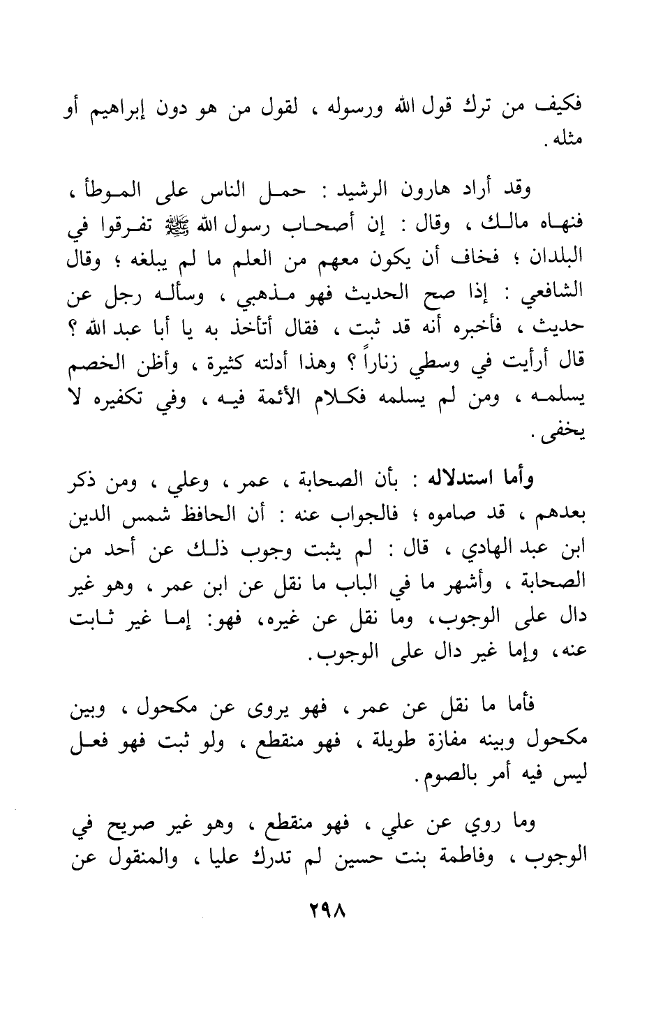 وقد أراد هارون الرشيد حمل الناس على الموطإ، فنهاه مالك، وقال: إن أصحاب رسول الله صلى الله عليه وسلم تفرقوا في البلدان، فخاف أن يكون معهم من العلم ما لم يبلغه. وقال الشافعي: إذا صح الحديث فهو مذهبي. وسأله رجل عن حديث، فأخبره أنه قد ثبت، فقال: أتأخذ به يا أبا عبد الله؟ قال: أرأيت في وسطي زناراً؟ وهذا أدلته كثيرة، وأظن الخصم يسلمه، ومن لم يسلمه فكلام الأئمة فيه وفي تكفيره لا يخفى.