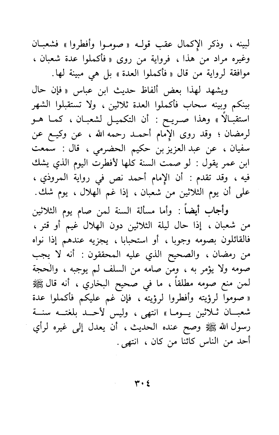 ويشهد لهذا بعض ألفاظ حديث ابن عباس: " فإن حال بينكم وبينه سحاب، فأكملوا العدة ثلاثين، ولا تستقبلوا الشهر استقبالاً " 3، وهذا صريح أن التكميل لشعبان، كما هو لرمضان. وقد روى الإمام أحمد، رحمه الله، عن وكيع عن سفيان عن عبد العزيز بن حكيم الحضرمي، قال: " سمعت ابن عمر يقول: لو صمت السنة كلها لأفطرت اليوم الذي يشك فيه "؛ وقد تقدم: أن الإمام أحمد نص في رواية المروذي، على أن يوم الثلاثين من شعبان، إذا غم الهلال، يوم شك.