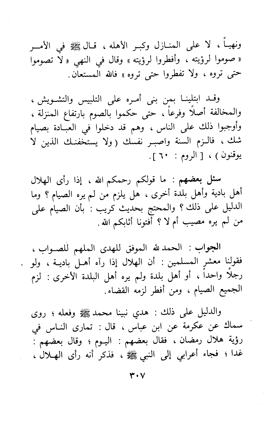 ونهياً، لا على المنازل وكبر الأهلة، قال صلى الله عليه وسلم في الأمر: " صوموا لرؤيته، وأفطروا لرؤيته " 1، وقال في النهي:" لا تصوموا حتى تروه، ولا تفطروا حتى تروه " 2. فالله المستعان.