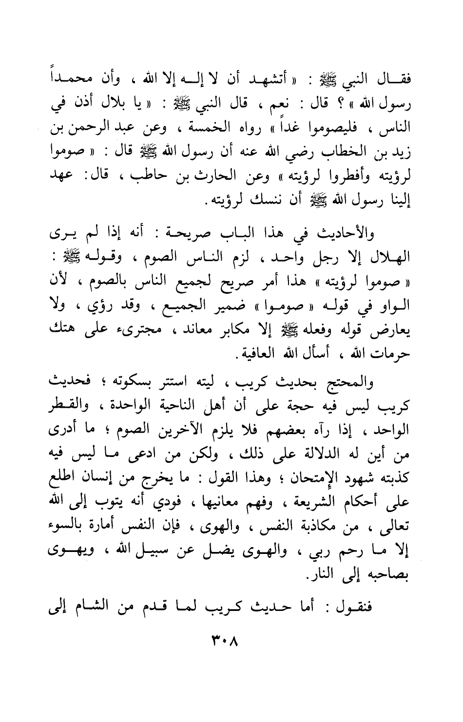 والمحتج بحديث كريب، ليته استتر بسكوته، فحديث كريب ليس فيه حجة على أن أهل الناحية الواحدة، والقطر الواحد، إذا رآه بعضهم فلا يلزم الآخرين الصوم، ما أدري من أين له الدلالة على ذلك؟ ولكن مَن ادعى ما ليس فيه كذبته شهود الامتحان. وهذا القول ما يخرج من إنسان اطلع على أحكام الشريعة، وفهم معانيها؛ فودي أنه يتوب إلى الله تعالى، من مكاذبة النفس والهوى، فإن النفس أمارة بالسوء إلا ما رحم ربي، والهوى يضل عن سبيل الله، ويهوي بصاحبه إلى النار.