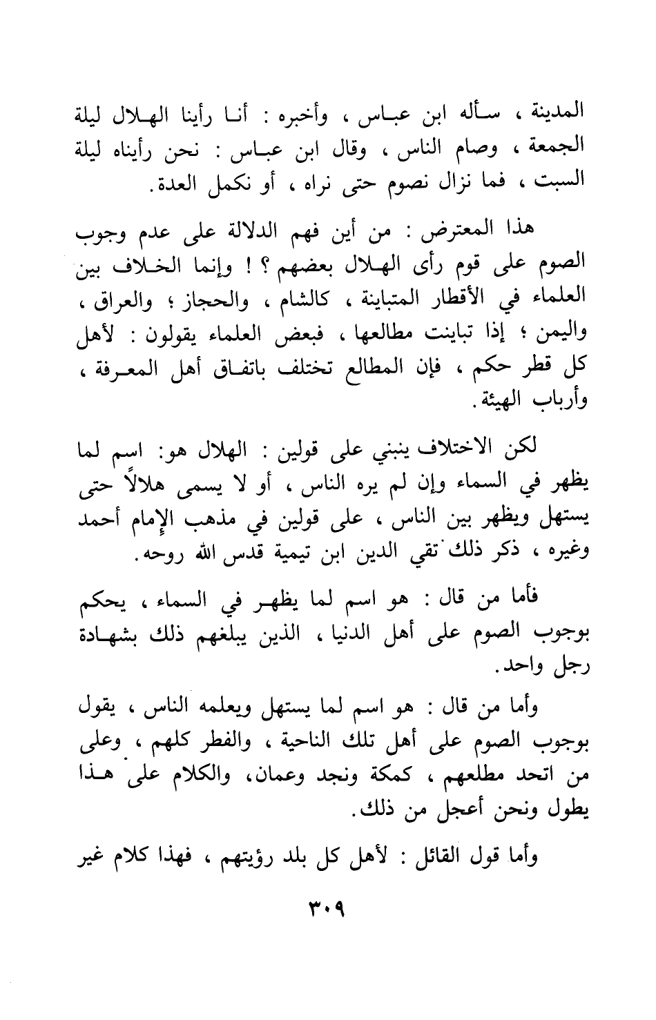 وأما من قال: هو اسم لما يستهل ويعلمه الناس، يقول بوجوب الصوم على أهل تلك الناحية، والفطر كلهم، وعلى من اتحد مطلعهم، كمكة ونجد وعمان؛ والكلام على هذا يطول ونحن أعجل من ذلك.