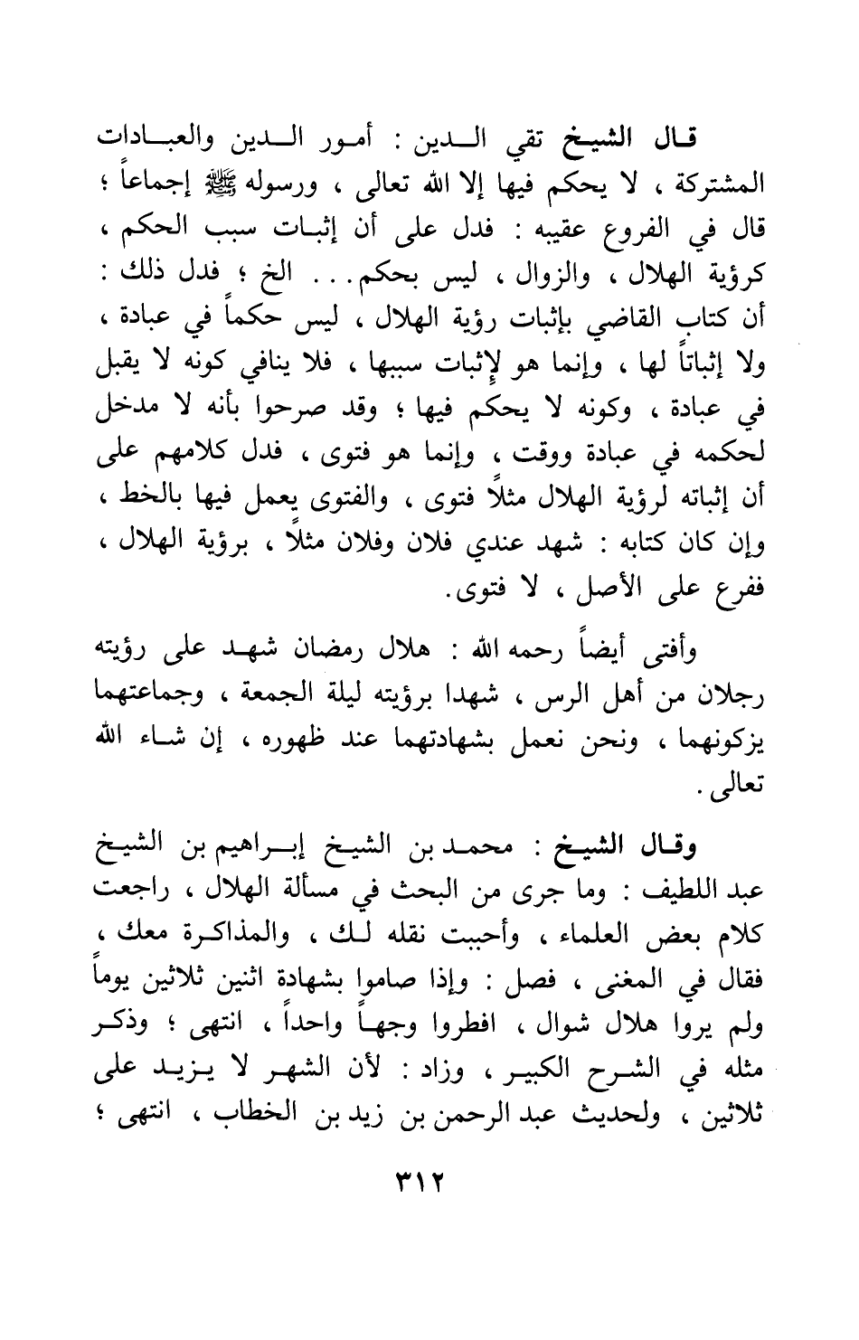 وقال الشيخ محمد بن الشيخ إبراهيم بن الشيخ عبد اللطيف: وما جرى من البحث في مسألة الهلال، راجعت كلام بعض العلماء، وأحببت نقله لك، والمذاكرة معك. فقال في المغني: فصل: وإذا صاموا بشهادة اثنين ثلاثين يوماً ولم يروا هلال شوال، أفطروا وجهاً واحداً. انتهى. وذكر مثله في الشرح الكبير، وزاد: لأن الشهر لا يزيد على ثلاثين، ولحديث عبد الرحمن بن زيد بن الخطاب.، انتهى.