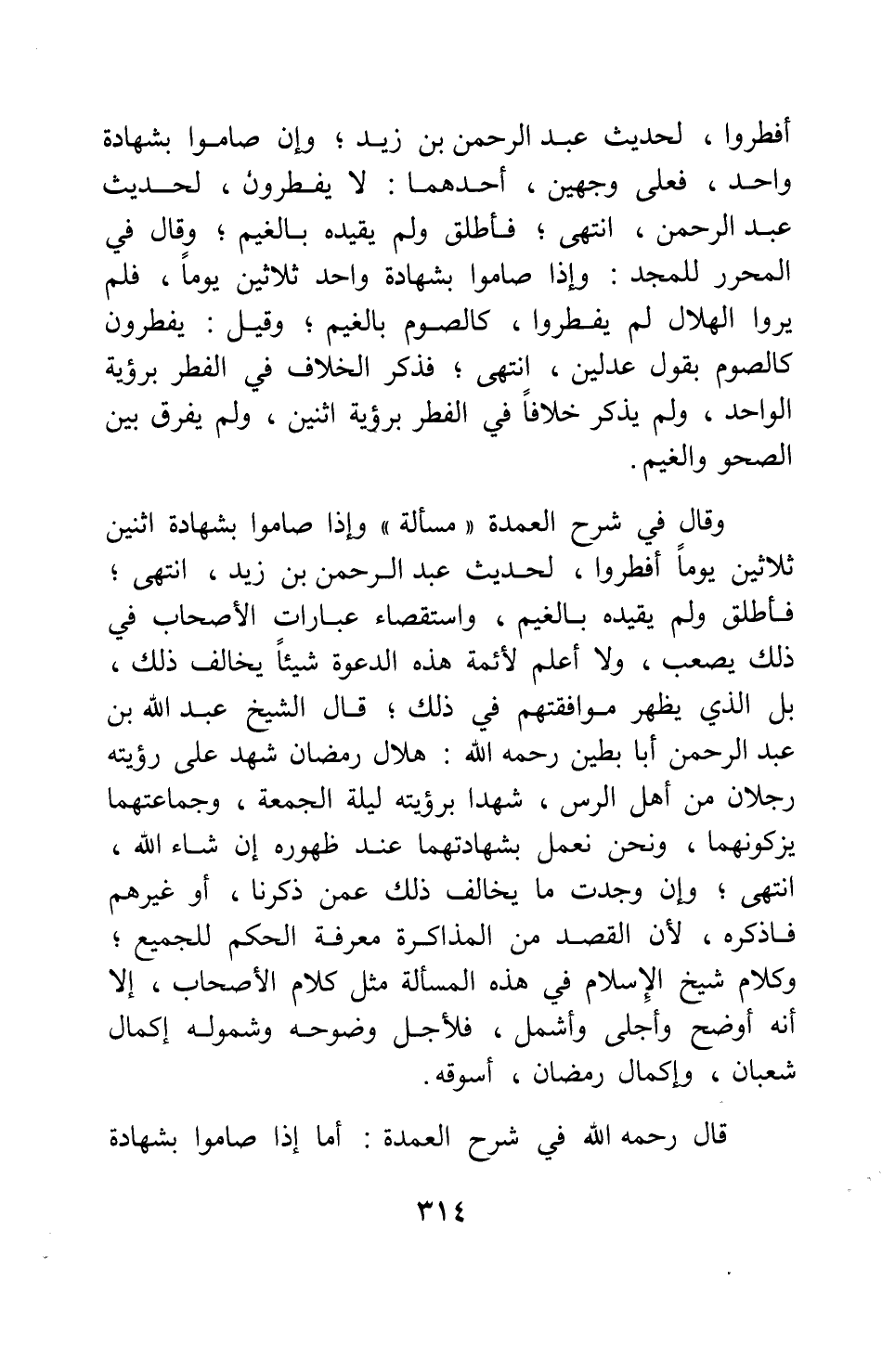 وقال في شرح العمدة: مسألة: وإذا صاموا بشهادة اثنين ثلاثين يوماً أفطروا، لحديث عبد الرحمن بن زيد. انتهى. فأطلق ولم يقيده بالغيم. واستقصاء عبارات الأصحاب في ذلك يصعب، ولا أعلم لأئمة هذه الدعوة شيئاً يخالف ذلك؛ بل الذي يظهر موافقتهم في ذلك; قال الشيخ عبد الله بن عبد الرحمن أبا بطين، رحمه الله: هلال رمضان شهد على رؤيته رجلان من أهل الرس، شهدا برؤيته ليلة الجمعة، وجماعتهما يزكونهما، ونحن نعمل بشهادتهما عند ظهوره إن شاء الله. انتهى. وإن وجدت ما يخالف ذلك عمن ذكرنا أو غيرهم فاذكره، لأن القصد من المذاكرة معرفة الحكم للجميع. وكلام شيخ الإسلام في هذه المسألة مثل كلام الأصحاب، إلا أنه أوضح وأجلى وأشمل، فلأجل وضوحه وشموله إكمال شعبان، وإكمال رمضان، أسوقه.