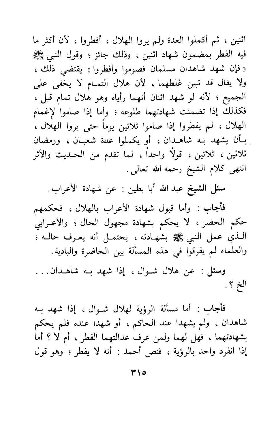 فأجاب: وأما قبول شهادة الأعراب بالهلال، فحكمهم حكم الحضر، لا يحكم بشهادة مجهول الحال. والأعرابي الذي عمل النبي صلى الله عليه وسلم بشهادته، يحتمل أنه يعرف حاله. والعلماء لم يفرقوا في هذه المسألة بين الحاضرة والبادية.