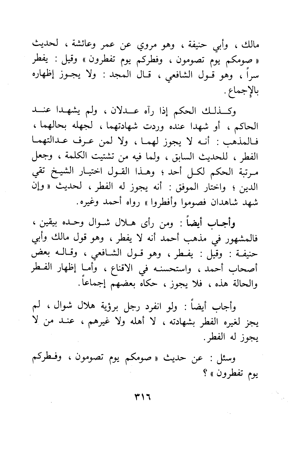 وأجاب أيضاً: ولو انفرد رجل برؤية هلال شوال، لم يجز لغيره الفطر بشهادته، لا أهله ولا غيرهم، عند من لا يجوز له الفطر.
