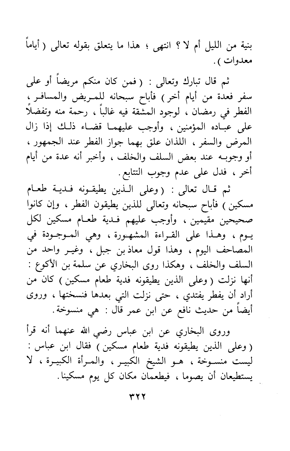 ثم قال تبارك وتعالى: {فَمَنْ كَانَ مِنْكُمْ مَرِيضاً أَوْ عَلَى سَفَرٍ فَعِدَّةٌ مِنْ أَيَّامٍ أُخَرَ} [سورة البقرة آية: 184] ؛ فأباح سبحانه للمريض والمسافر، الفطر في رمضان، لوجود المشقة فيه غالباً، رحمة منه وتفضلاً على عباده المؤمنين، وأوجب عليهما قضاء ذلك إذا زال المرض والسفر اللذان علق بهما جواز الفطر عند الجمهور، أو وجوبه عند بعض السلف والخلف، وأخبر أنه عدة من أيام أخر؛ فدل على عدم وجوب التتابع. ثم قال تعالى: {وَعَلَى الَّذِينَ يُطِيقُونَهُ فِدْيَةٌ طَعَامُ مِسْكِينٍ} [سورة البقرة آية: 184] ، فأباح سبحانه وتعالى للذين يطيقون الفطر، وإن كانوا صحيحين مقيمين، وأوجب عليهم فدية طعام مسكين لكل يوم؛ وهذا على القراءة المشهورة، وهي الموجودة في المصاحف اليوم، وهذا قول معاذ بن جبل، وغير واحد من السلف والخلف. وهكذا روى البخاري عن سلمة بن الأكوع: أنها نزلت: {وَعَلَى الَّذِينَ يُطِيقُونَهُ فِدْيَةٌ طَعَامُ مِسْكِينٍ} [سورة البقرة آية: 184] ، كان من أراد أن يفطر يفتدي، حتى نزلت التي بعدها فنسختها. وروى أيضاً من حديث نافع عن ابن عمر قال: هي منسوخة. وروى البخاري عن ابن عباس، رضي الله عنهما، أنه قرأ: {وَعَلَى الَّذِينَ يُطِيقُونَهُ فِدْيَةٌ طَعَامُ مِسْكِينٍ} فقال ابن عباس: " ليست منسوخة، هو الشيخ الكبير، والمرأة الكبيرة، لا يستطيعان أن يصوما، فيطعمان مكان كل يوم مسكيناً ".