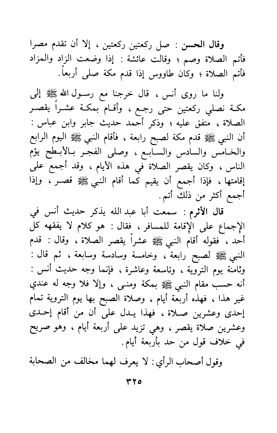 قال الأثرم: سمعت أبا عبد الله يذكر حديث أنس في الإجماع على الإقامة للمسافر، فقال: هو كلام لا يفقهه كل أحد، فقوله: أقام النبي صلى الله عليه وسلم عشرا يقصر الصلاة، وقال: قدم النبي صلى الله عليه وسلم لصبح رابعة، وخامسة وسادسة وسابعة، ثم قال: وثامنة يوم التروية، وتاسعة وعاشرة، فإنما وجه حديث أنس: أنه حسب مقام النبي صلى الله عليه وسلم بمكة ومنى، وإلا فلا وجه له عندي غير هذا، فهذه أربعة أيام، وصلاة الصبح بها يوم التروية تمام إحدى وعشرين صلاة؛ فهذا يدل على أن من أقام إحدى وعشرين صلاة يقصر، وهي تزيد على أربعة أيام، وهو صريح في خلاف قول من حد بأربعة أيام.