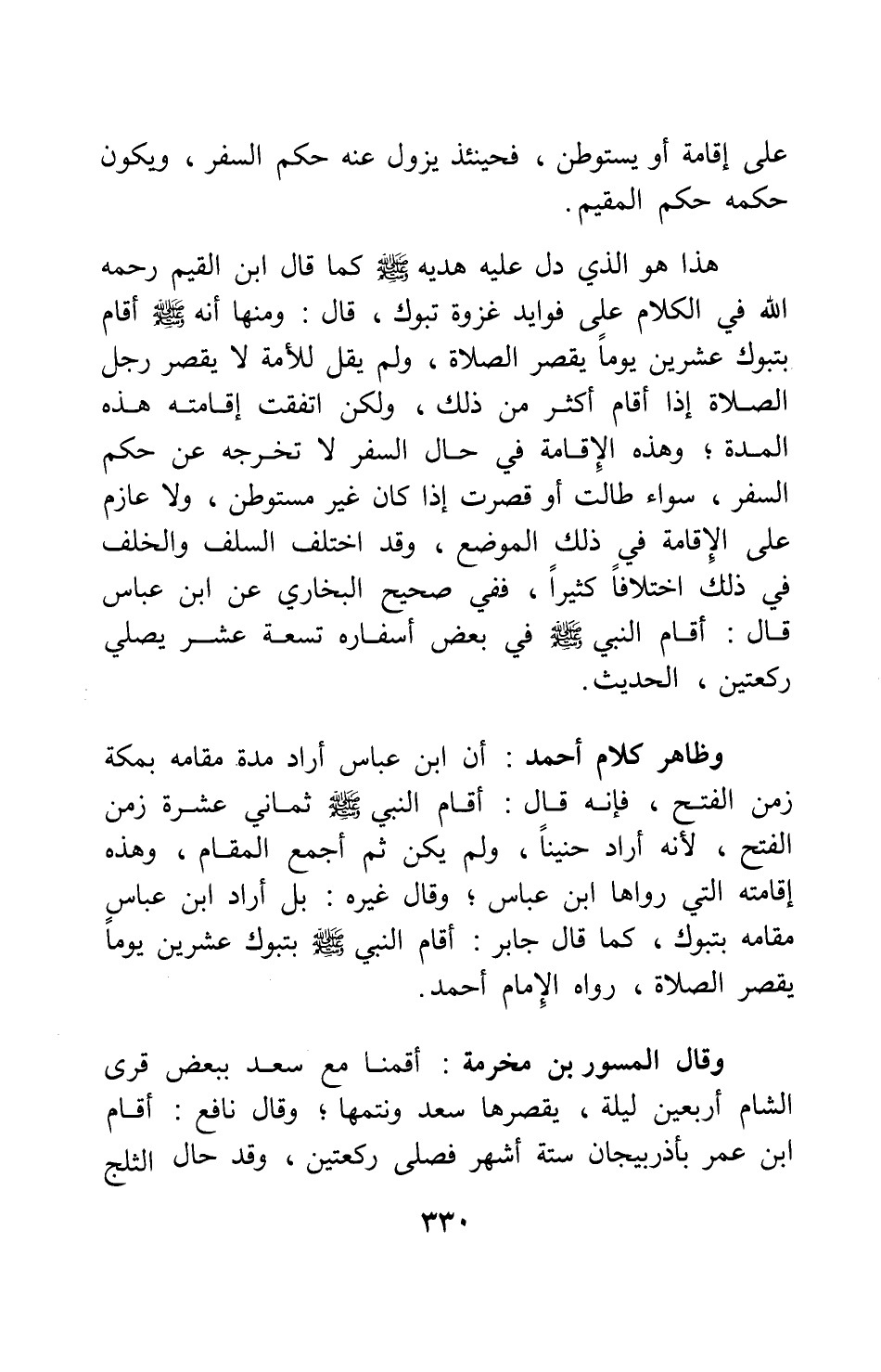 هذا هو الذي دل عليه هديه صلى الله عليه وسلم كما قال ابن القيم، رحمه الله، في الكلام على فوائد غزوة تبوك، قال: ومنها أنه صلى الله عليه وسلم أقام بتبوك عشرين يوماً يقصر الصلاة، ولم يقل للأمة: لا يقصر رجل الصلاة إذا أقام أكثر من ذلك، ولكن اتفقت إقامته هذه المدة؛ وهذه الإقامة في حال السفر لا تخرجه عن حكم السفر، سواء طالت أو قصرت إذا كان غير مستوطن، ولا عازم على الإقامة في ذلك الموضع. وقد اختلف السلف والخلف في ذلك اختلافاً كثيراً، ففي صحيح البخاري عن ابن عباس قال: " أقام النبي صلى الله عليه وسلم في بعض أسفاره تسعة عشر يصلي ركعتين " 1 الحديث.