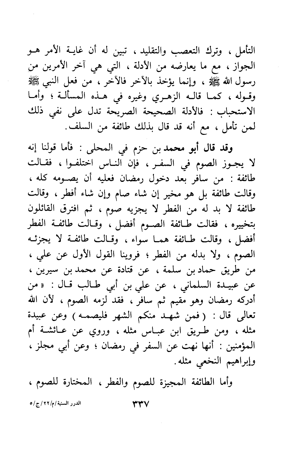 وقد قال أبو محمد ابن حزم في المحلى: فأما قولنا إنه لا يجوز الصوم في السفر، فإن الناس اختلفوا: فقالت طائفة: من سافر بعد دخول رمضان فعليه أن يصومه كله، وقالت طائفة بل هو مخير إن شاء صام وإن شاء أفطر، وقالت طائفة لا بد له من الفطر، لا يجزيه صوم. ثم افترق القائلون بتخييره: فقالت طائفة: الصوم أفضل، وقالت طائفة: الفطر أفضل، وقالت طائفة: هما سواء، وقالت طائفة: لا يجزئه الصوم، ولا بد له من الفطر. فروينا القول الأول عن علي، من طريق حماد بن سلمة عن قتادة عن محمد ابن سيرين عن عبيدة السلماني عن علي بن أبي طالب قال: " من أدركه رمضان وهو مقيم ثم سافر، فقد لزمه الصوم، لأن الله تعالى قال: {فَمَنْ شَهِدَ مِنْكُمُ الشَّهْرَ فَلْيَصُمْهُ} "، وعن عبيدة مثله، ومن طريق ابن عباس مثله، وروي عن عائشة أم المؤمنين: " أنها نهت عن السفر في رمضان "، وعن أبي مجلز، وإبراهيم النخعي مثله.