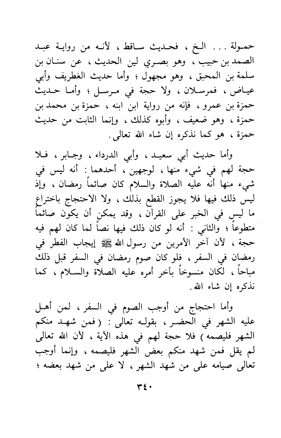 حمولة ... إلخ "، فحديث ساقط، لأنه من رواية عبد الصمد بن حبيب، وهو بصري لين الحديث عن سنان بن سلمة بن المحبق، وهو مجهول. وأما حديث الغطريف وأبي عياض، فمرسلان، ولا حجة في مرسل. وأما حديث حمزة بن عمرو، فإنه من رواية ابن ابنه: حمزة بن محمد بن حمزة، وهو ضعيف، وأبوه كذلك؛ وإنما الثابت من حديث حمزة، هو كما نذكره إن شاء الله تعالى.