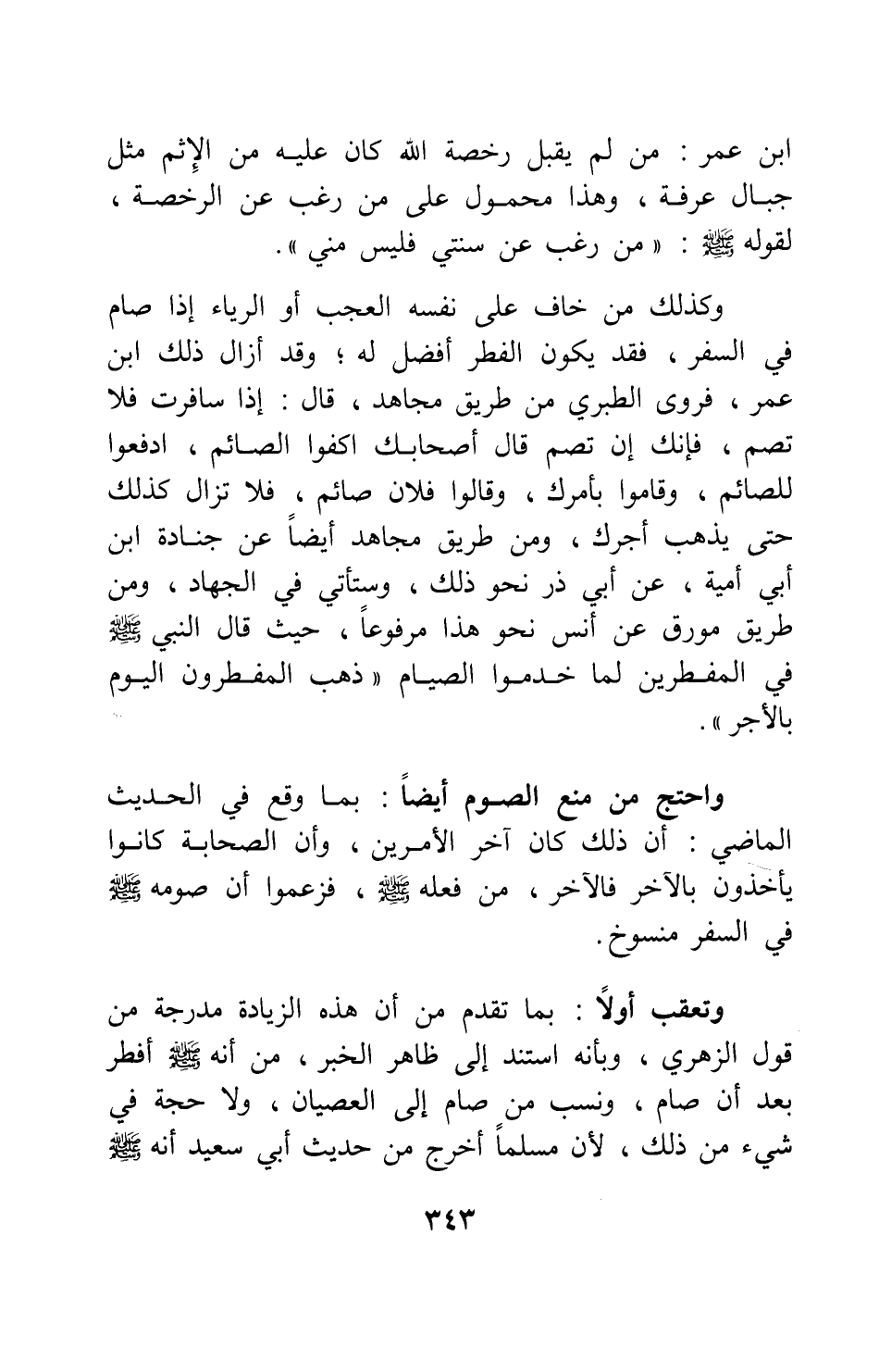 وكذلك من خاف على نفسه العجب أو الرياء إذا صام في السفر، فقد يكون الفطر أفضل له; وقد أزال ذلك ابن عمر، فروى الطبري من طريق مجاهد، قال: " إذا سافرت فلا تصم، فإنك إن تصم قال أصحابك: اكفوا الصائم، ادفعوا للصائم، وقاموا بأمرك، وقالوا: فلان صائم؛ فلا تزال كذلك حتى يذهب أجرك "، ومن طريق مجاهد أيضاً عن جنادة بن أبي أمية عن أبي ذر نحو ذلك، وستأتي في الجهاد، ومن طريق مورق عن أنس نحو هذا مرفوعاً، حيث قال النبي صلى الله عليه وسلم في المفطرين لما خدموا الصيام: " ذهب المفطرون اليوم بالأجر " 2.