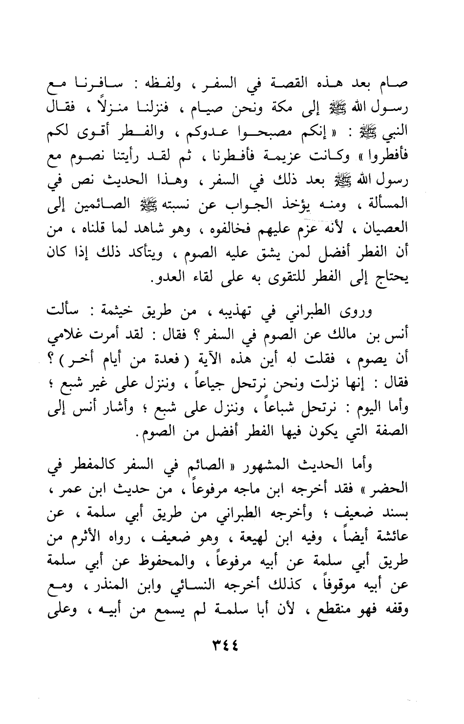 وروى الطبراني في تهذيبه، من طريق خيثمة: " سألت أنس بن مالك عن الصوم في السفر؟ فقال: لقد أمرت غلامي أن يصوم، فقلت له: أين هذه الآية: {فَعِدَّةٌ مِنْ أَيَّامٍ أُخَرَ} فقال: إنها نزلت ونحن نرتحل جياعاً، وننْزل على غير شبع; وأما اليوم، نرتحل شباعاً، وننْزل على شبع "، وأشار أنس إلى الصفة التي يكون فيها الفطر أفضل من الصوم.