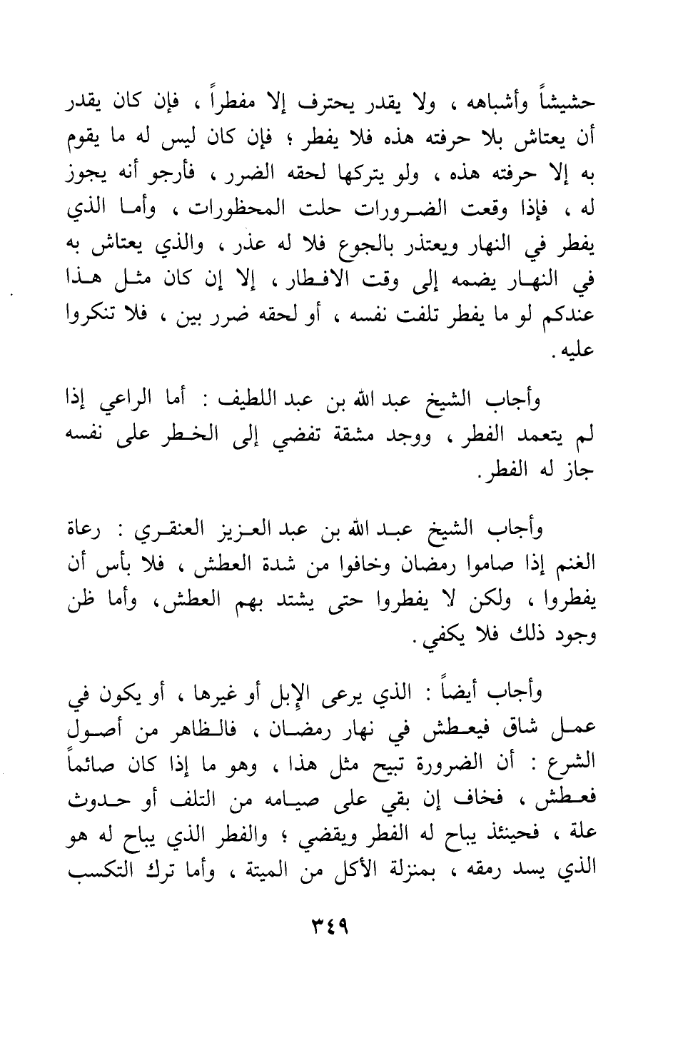 وأجاب أيضاً: الذي يرعى الإبل أو غيرها، أو يكون في عمل شاق فيعطش في نهار رمضان، فالظاهر من أصول الشرع: أن الضرورة تبيح مثل هذا، وهو: ما إذا كان صائماً فعطش فخاف إن بقي على صيامه من التلف أو حدوث علة، فحينئذ يباح له الفطر ويقضي; والفطر الذي يباح له هو الذي يسد رمقه، بمنْزلة الأكل من الميتة. وأما ترك التكسب