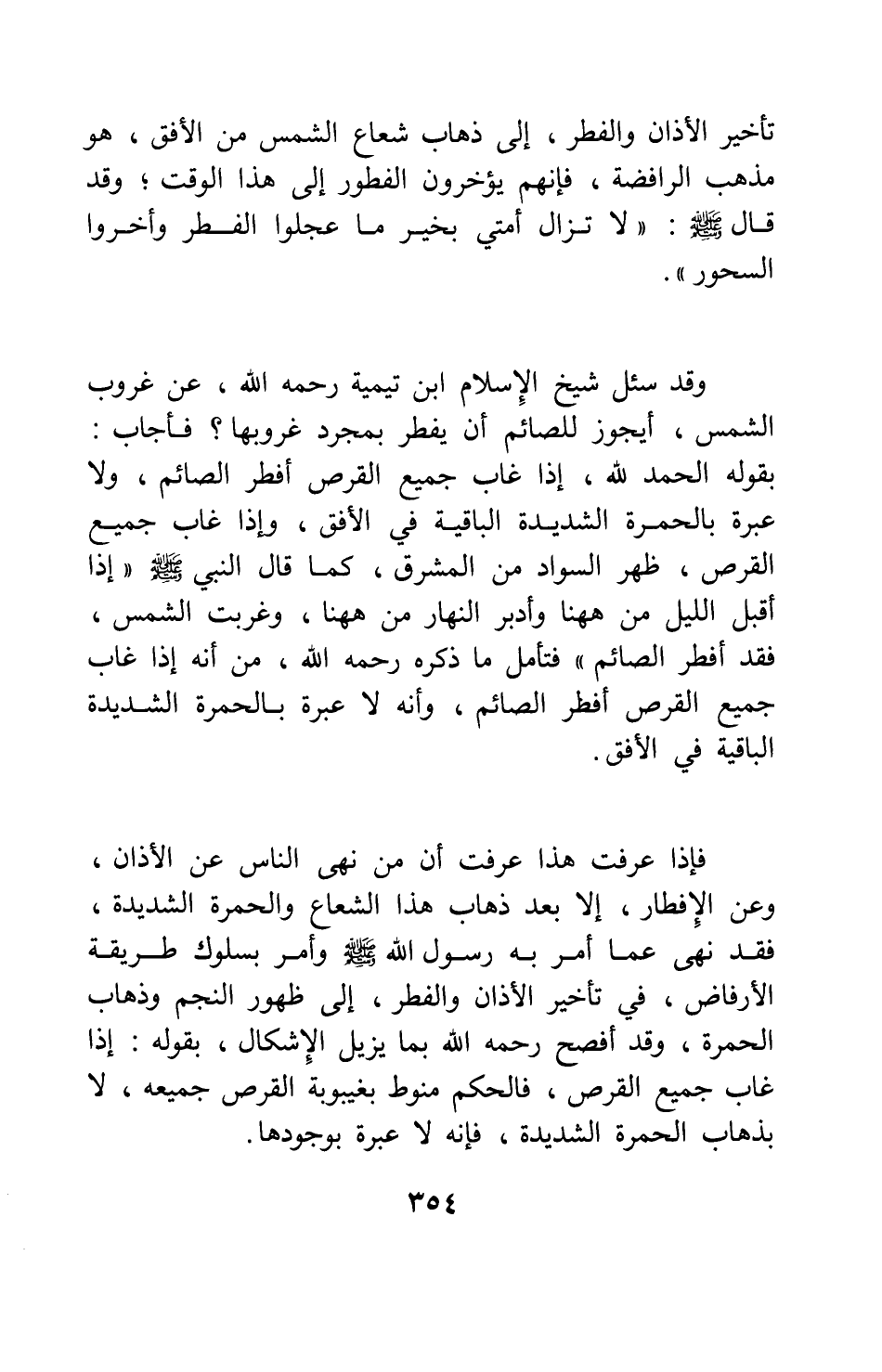 فإذا عرفت هذا، عرفت أن من نهى الناس عن الأذان، وعن الإفطار، إلا بعد ذهاب هذا الشعاع والحمرة الشديدة، فقد نهى عما أمر به رسول الله صلى الله عليه وسلم، وأمر بسلوك طريقة الأرفاض، في تأخير الأذان والفطر إلى ظهور النجم وذهاب الحمرة؛ وقد أفصح، رحمه الله، بما يزيل الإشكال، بقوله: إذا غاب جميع القرص، فالحكم منوط بغيبوبة القرص جميعه، لا بذهاب الحمرة الشديدة، فإنه لا عبرة بوجودها.
