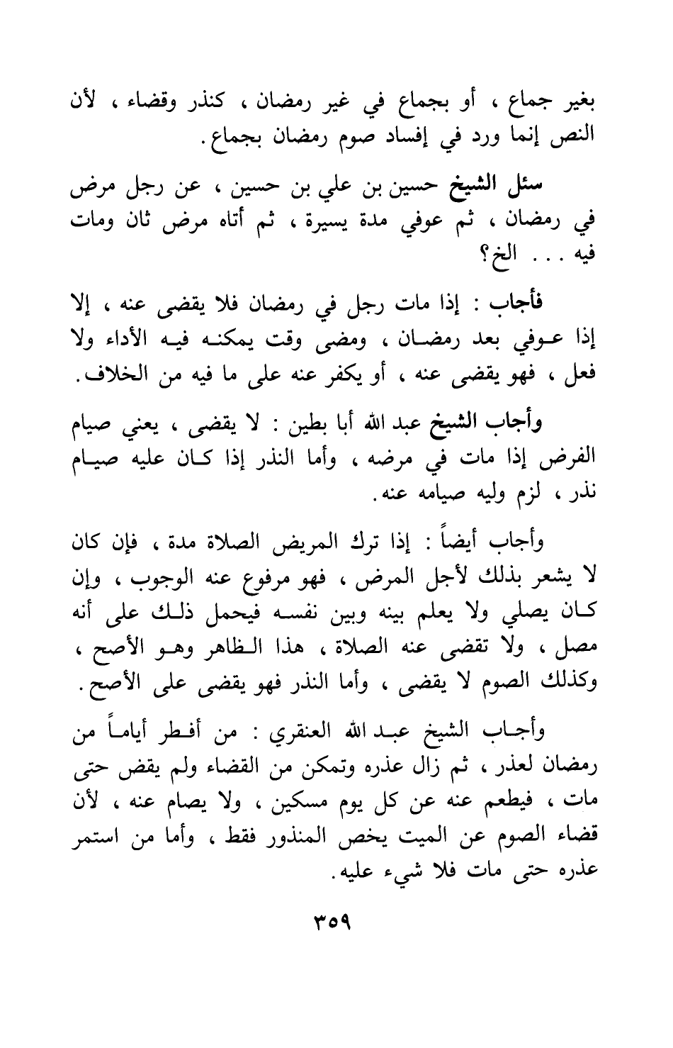 سئل الشيخ حسين بن علي بن حسين: عن رجل مرض في رمضان ثم عوفي مدة يسيرة، ثم أتاه مرض ثان ومات فيه ... إلخ؟