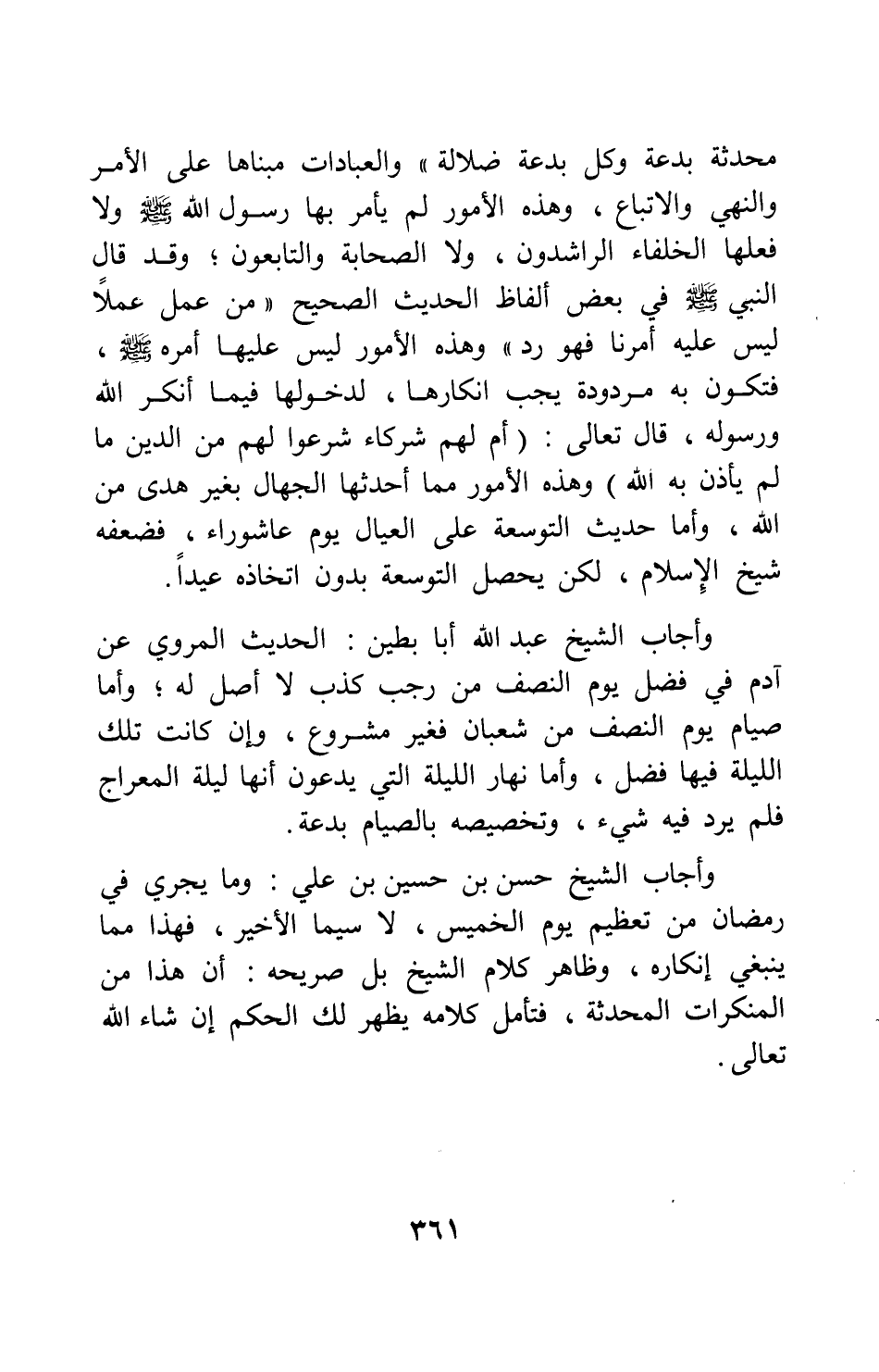 وأجاب الشيخ عبد الله أبا بطين: الحديث المروي عن آدم، في فضل يوم النصف من رجب كذب لا أصل له. وأما صيام يوم النصف من شعبان فغير مشروع، وإن كانت تلك الليلة فيها فضل. وأما نهار الليلة التي يدعون أنها ليلة المعراج فلم يرد فيه شيء، وتخصيصه بالصيام بدعة.