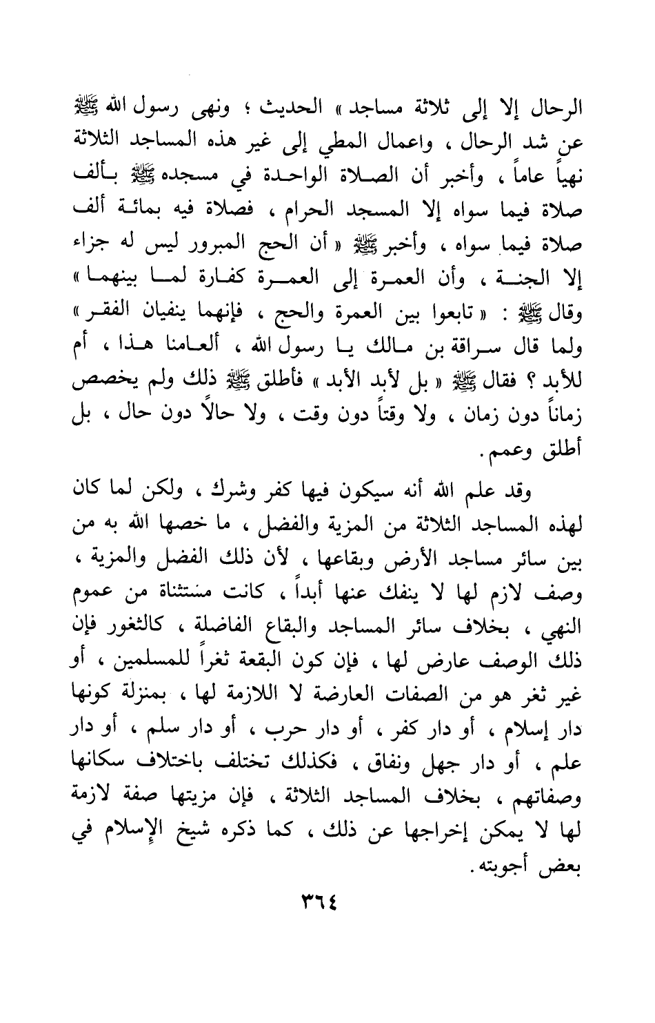 الرحال إلا إلى ثلاثة مساجد " 1 الحديث. ونهى رسول الله صلى الله عليه وسلم عن شد الرحال، وإعمال المطي إلى غير هذه المساجد الثلاثة نهياً عاماً، وأخبر أن الصلاة الواحدة في مسجده صلى الله عليه وسلم بألف صلاة فيما سواه إلا المسجد الحرام، فصلاة فيه بمائة ألف صلاة فيما سواه. وأخبر صلى الله عليه وسلم " أن الحج المبرور ليس له جزاء إلا الجنة، وأن العمرة إلى العمرة كفارة لما بينهما " 2، وقال صلى الله عليه وسلم: " تابعوا بين العمرة والحج، فإنهما ينفيان الفقر " 3، ولما قال سراقة بن مالك: يا رسول الله، ألعامنا هذا، أم للأبد؟ فقال صلى الله عليه وسلم: " بل لأبد الأبد " 4، فأطلق صلى الله عليه وسلم ذلك، ولم يخصص زماناً دون زمان، ولا وقتاً دون وقت، ولا حالاً دون حال، بل أطلق وعمم.