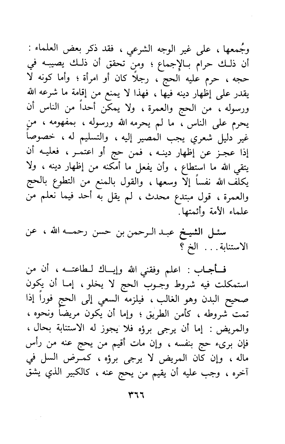 فأجاب: اعلم، وفقني الله وإياك لطاعته، أن من استكملت فيه شروط وجوب الحج لا يخلو، إما أن يكون صحيح البدن وهو الغالب، فيلزمه السعي إلى الحج فوراً إذا تمت شروطه، كأمن الطريق، وإما أن يكون مريضاً ونحوه، والمريض إما أن يرجى برؤه فلا يجوز له الاستنابة بحال، فإن برئ حج بنفسه، وإن مات أقيم من يحج عنه من رأس ماله. وإن كان المريض لا يرجى برؤه، كمرض السل في آخره، وجب عليه أن يقيم من يحج عنه، كالكبير الذي يشق