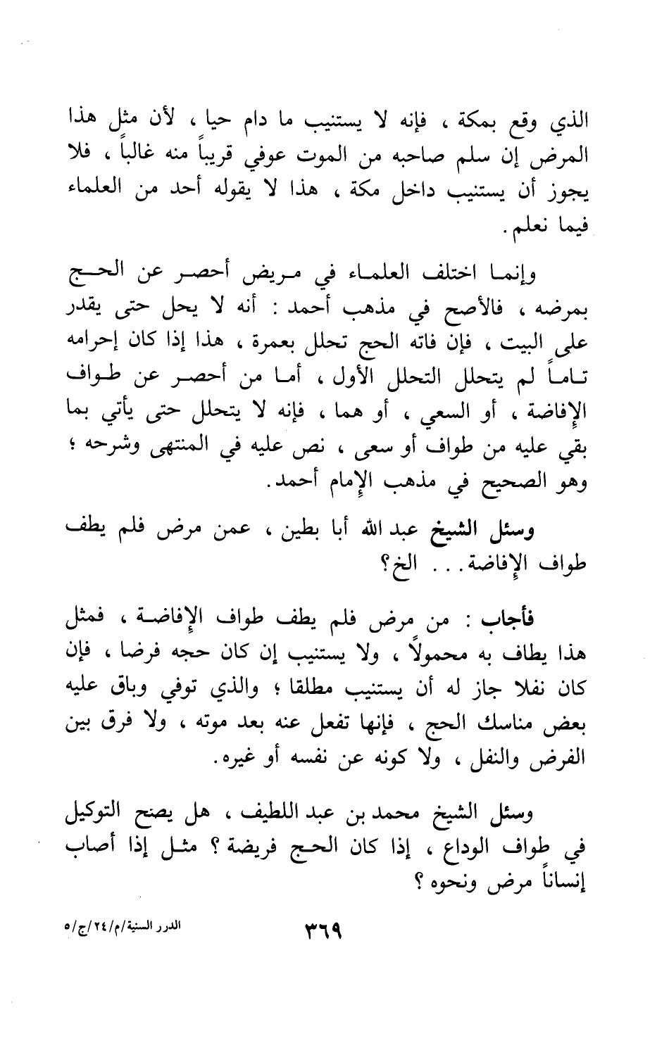 فأجاب: من مرض فلم يطف طواف الإفاضة، فمثل هذا يطاف به محمولاً، ولا يستنيب إن كان حجه فرضاً، فإن كان نفلاً جاز له أن يستنيب مطلقاً. والذي توفي وباق عليه بعض مناسك الحج، فإنها تفعل عنه بعد موته، ولا فرق بين الفرض والنفل، ولا كونه عن نفسه أو غيره.