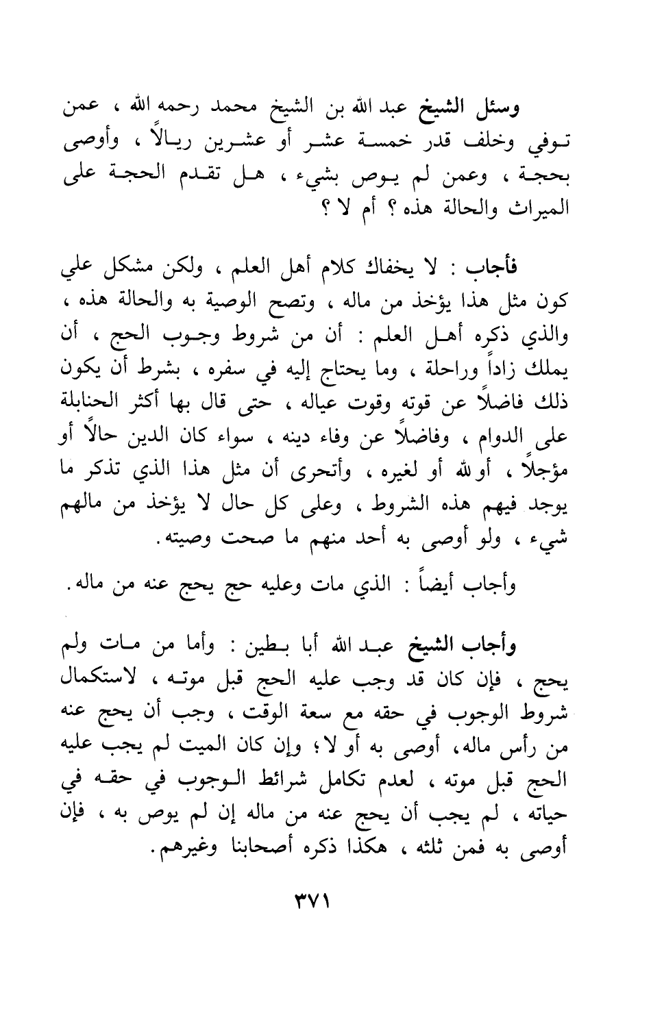 وأجاب الشيخ عبد الله أبا بطين: وأما من مات ولم يحج، فإن كان قد وجب عليه الحج قبل موته، لاستكمال شروط الوجوب في حقه مع سعة الوقت، وجب أن يحج عنه من رأس ماله، أوصى به أو لا. وإن كان الميت لم يجب عليه الحج قبل موته، لعدم تكامل شرائط الوجوب في حقه في حياته، لم يجب أن يحج عنه من ماله إن لم يوص به، فإن أوصى به فمن ثلثه؛ هكذا ذكره أصحابنا وغيرهم.