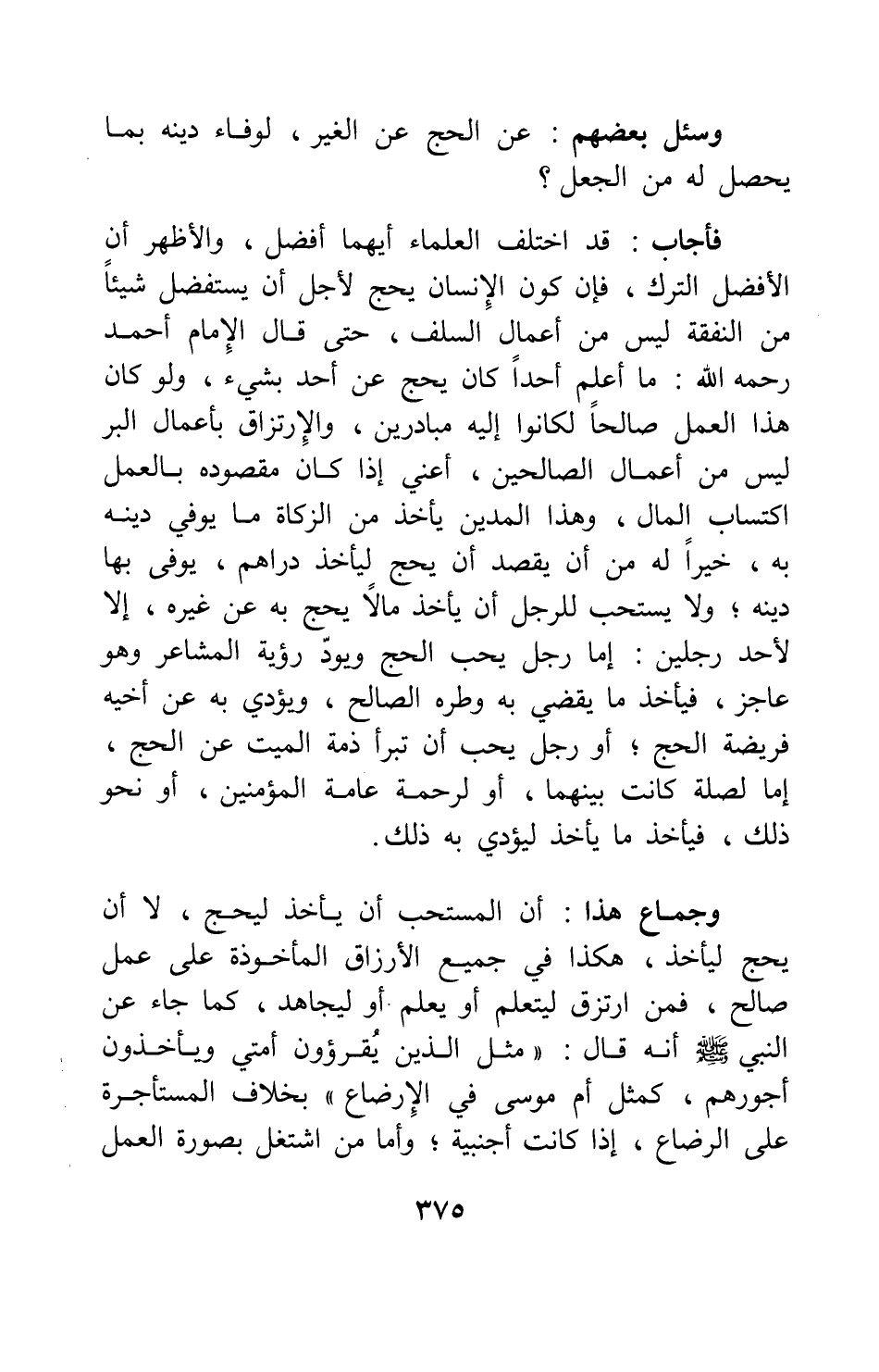 وسئل بعضهم: عن الحج عن الغير لوفاء دينه بما يحصل له من الجعل؟ فأجاب: قد اختلف العلماء أيهما أفضل، والأظهر أن الأفضل الترك؛ فإن كون الإنسان يحج لأجل أن يستفضل شيئاً من النفقة ليس من أعمال السلف، حتى قال الإمام أحمد، رحمه الله: ما أعلم أحداً كان يحج عن أحد بشيء، ولو كان هذا العمل صالحاً لكانوا إليه مبادرين. والارتزاق بأعمال البر ليس من أعمال الصالحين، أعني إذا كان مقصوده بالعمل اكتساب المال. وهذا المدين يأخذ من الزكاة ما يوفي دينه به، خيراً له من أن يقصد أن يحج ليأخذ دراهم يوفي بها دينه. ولا يستحب للرجل أن يأخذ مالاً يحج به عن غيره، إلا لأحد رجلين: إما رجل يحب الحج ويودّ رؤية المشاعر وهو عاجز، فيأخذ ما يقضي به وطره الصالح، ويؤدي به عن أخيه فريضة الحج، أو رجل يحب أن تبرأ ذمة الميت عن الحج، إما لصلة كانت بينهما، أو لرحمة عامة المؤمنين، أو نحو ذلك، فيأخذ ما يأخذ ليؤدي به ذلك.