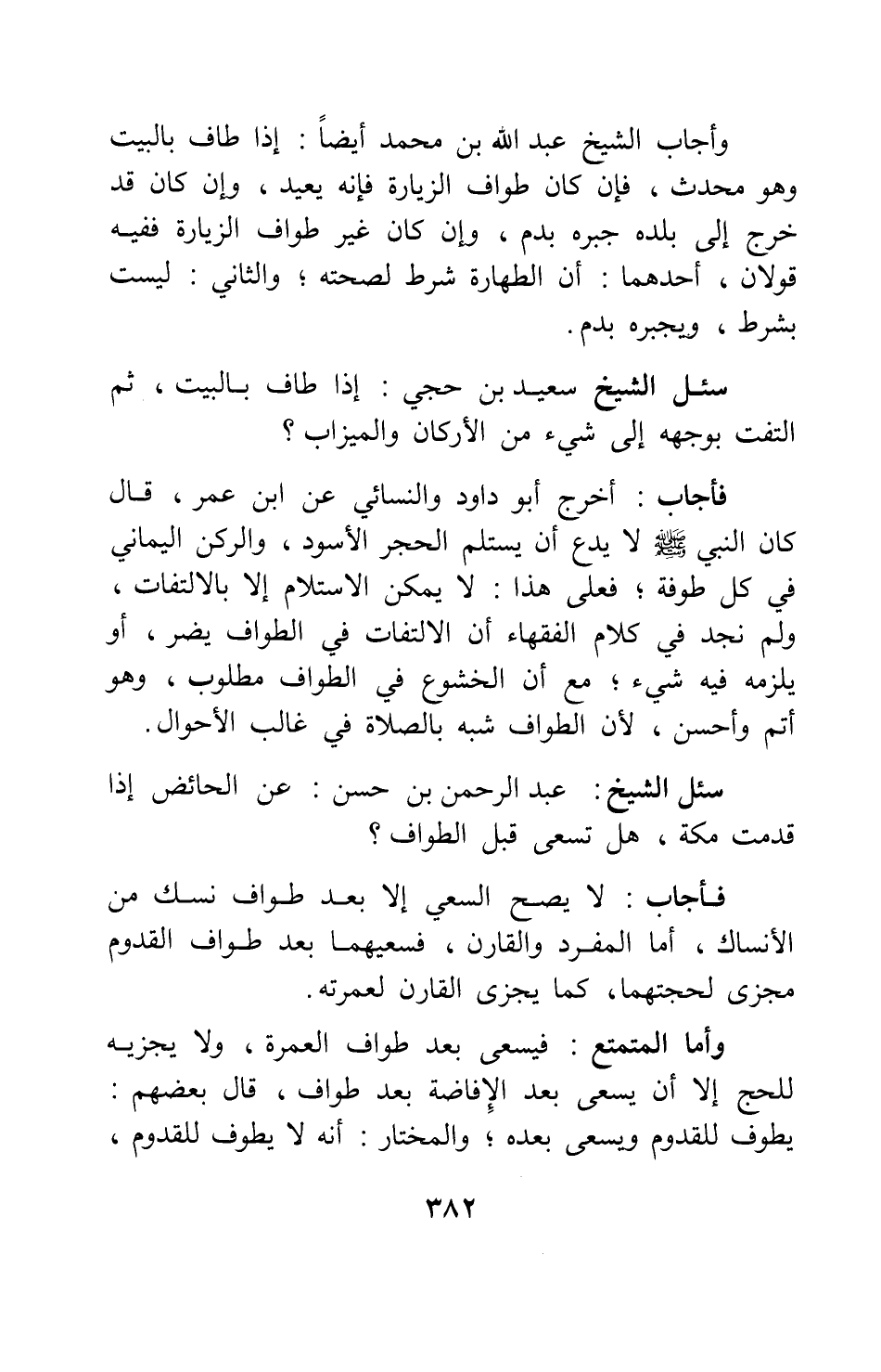 وأجاب الشيخ عبد الله بن محمد أيضاً: إذا طاف بالبيت وهو مُحْدِث، فإن كان طواف الزيارة فإنه يعيد، وإن كان قد خرج إلى بلده جبره بدم. وإن كان غير طواف الزيارة ففيه قولان: أحدهما: أن الطهارة شرط لصحته، والثاني: ليست بشرط، ويجبره بدم.