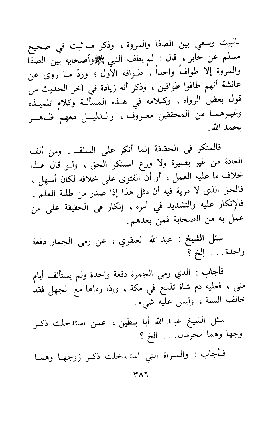 بالبيت وسعي بين الصفا والمروة، وذكر ما ثبت في صحيح مسلم عن جابر، قال: " لم يطف النبي صلى الله عليه وسلم وأصحابه بين الصفا والمروة إلا طوافاً واحداً: طوافه الأول " 1، وردّ ما روي عن عائشة أنهم طافوا طوافين، وذكر أنه زيادة في آخر الحديث من قول بعض الرواة؛ وكلامه في هذه المسألة وكلام تلميذه وغيرهما من المحققين معروف، والدليل معهم ظاهر بحمد الله.