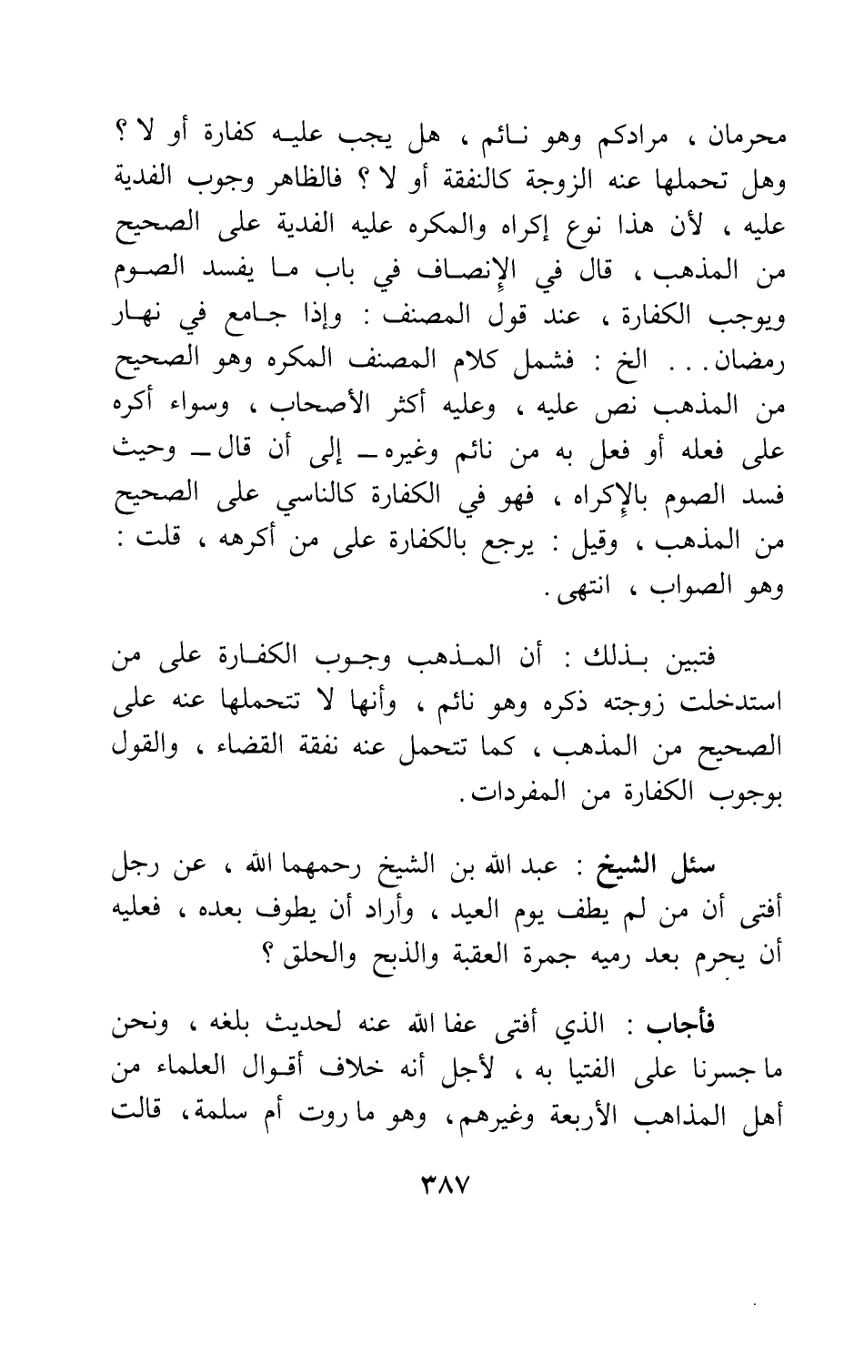 فأجاب: الذي أفتى، عفا الله عنه، لحديث بلغه، ونحن ما جسرنا على الفتيا به، لأجل أنه خلاف أقوال العلماء من أهل المذاهب الأربعة وغيرهم، وهو ما روت أم سلمة، قالت: