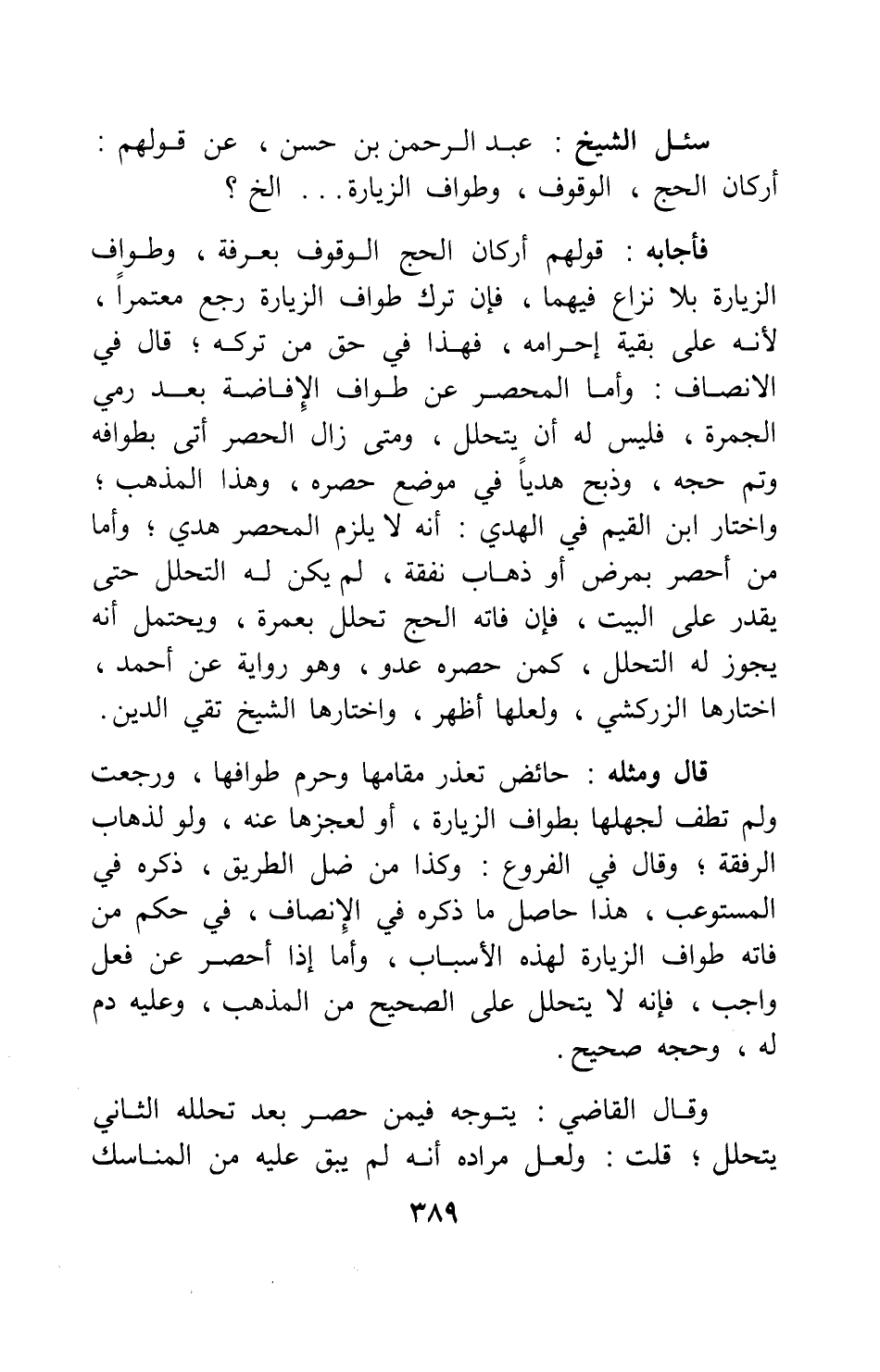 سئل الشيخ عبد الرحمن بن حسن: عن قولهم: أركان الحج: الوقوف، وطواف الزيارة ... إلخ؟
