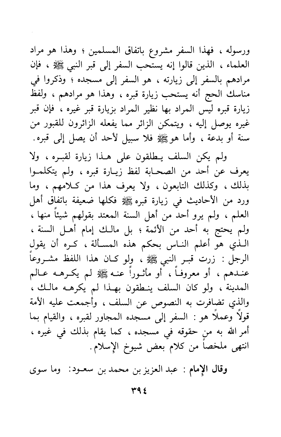 ولم يكن السلف يطلقون على هذا زيارة لقبره، ولا يعرف عن أحد من الصحابة لفظ زيارة قبره، ولم يتكلموا بذلك، وكذلك التابعون، ولا يعرف هذا من كلامهم؛ وما ورد من الأحاديث في زيارة قبره صلى الله عليه وسلم فكلها ضعيفة باتفاق أهل العلم، ولم يرو أحد من أهل السنة المعتد بقولهم شيئاً منها، ولم يحتج به أحد من الأئمة، بل مالك إمام أهل السنة، الذي هو أعلم الناس بحكم هذه المسألة، كره أن يقول الرجل: زرت قبر النبي صلى الله عليه وسلم؛ ولو كان هذا اللفظ مشروعاً عندهم، أو معروفاً، أو مأثوراً عنه صلى الله عليه وسلم لم يكرهه عالم المدينة، ولو كان السلف ينطقون بهذا لم يكرهه مالك. والذي تضافرت به النصوص عن السلف، وأجمعت عليه الأمة قولاً وعملاً هو: السفر إلى مسجده المجاور لقبره، والقيام بما أمر الله به من حقوقه في مسجده، كما يقام بذلك في غيره. انتهى ملخصاً من كلام بعض شيوخ الإسلام.