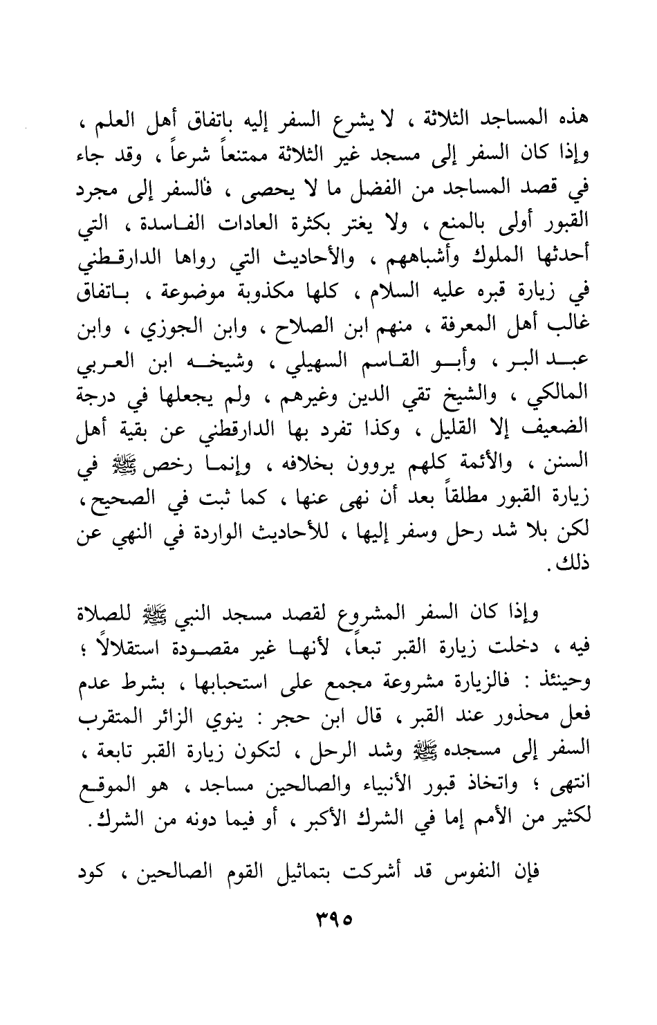 هذه المساجد الثلاثة، لا يشرع السفر إليه باتفاق أهل العلم. وإذا كان السفر إلى مسجد غير الثلاثة ممتنعاً شرعاً، وقد جاء في قصد المساجد من الفضل ما لا يحصى، فالسفر إلى مجرد القبور أولى بالمنع؛ ولا يغتر بكثرة العادات الفاسدة، التي أحدثها الملوك وأشباههم. والأحاديث التي رواها الدارقطني في زيارة قبره عليه السلام، كلها مكذوبة موضوعة، باتفاق غالب أهل المعرفة، منهم ابن الصلاح، وابن الجوزي، وابن عبد البر، وأبو القاسم السهيلي، وشيخه ابن العربي المالكي، والشيخ تقي الدين وغيرهم، ولم يجعلها في درجة الضعيف إلا القليل، وكذا تفرد بها الدارقطني عن بقية أهل السنن، والأئمة كلهم يروون بخلافه. وإنما رخص صلى الله عليه وسلم في زيارة القبور مطلقاً بعد أن نهى عنها، كما ثبت في الصحيح، لكن بلا شد رحل وسفر إليها، للأحاديث الواردة في النهي عن ذلك.