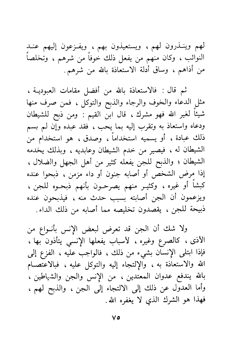 لهم وينذرون لهم، ويستعيذون بهم، ويفزعون إليهم عند النوائب؛ وكان منهم من يفعل ذلك خوفا من شرهم، وتخلصاً من أذاهم، وساق أدلة الاستعاذة بالله من شرهم. ثم قال: فالاستعاذة بالله من أفضل مقامات العبودية، مثل الدعاء والخوف والرجاء والذبح والتوكل، فمن صرف منها شيئاً لغير الله فهو مشرك.