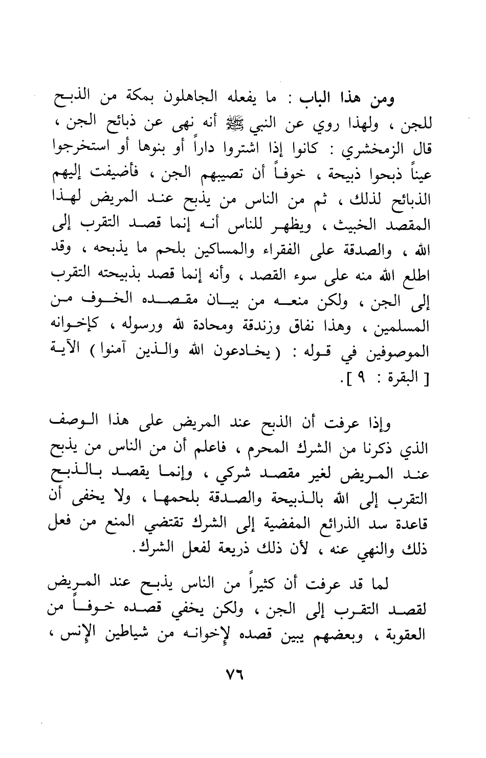 ومن هذا الباب: ما يفعله الجاهلون بمكة من الذبح للجن، ولهذا روي عن النبي صلى الله عليه وسلم " أنه نهى عن ذبائح الجن ". قال الزمخشري: كانوا إذا اشتروا داراً أو بنوها، أو استخرجوا عيناً، ذبحوا ذبيحة، خوفاً أن تصيبهم الجن، فأضيفت إليهم الذبائح لذلك. ثم من الناس من يذبح عند المريض لهذا المقصد الخبيث، ويظهر للناس أنه إنما قصد التقرب إلى الله، والصدقة على الفقراء والمساكين بلحم ما يذبحه، وقد اطلع الله منه على سوء القصد، وأنه إنما قصد بذبيحته التقرب إلى الجن، ولكن منعه من بيان مقصده الخوف من المسلمين؛ وهذا نفاق وزندقة ومحادة لله ورسوله، كإخوانه الموصوفين في قوله: {يُخَادِعُونَ اللَّهَ وَالَّذِينَ آمَنُوا} الآية [سورة البقرة آية: 9] . وإذا عرفت أن الذبح عند المريض على هذا الوصف الذي ذكرنا من الشرك المحرم، فاعلم: أن من الناس من يذبح عند المريض لغير مقصد شركي، وإنما يقصد بالذبح التقرب إلى الله بالذبيحة والصدقة بلحمها، ولا يخفى أن قاعدة سد الذرائع المفضية إلى الشرك تقتضي المنع من فعل ذلك والنهي عنه، لأن ذلك ذريعة لفعل الشرك، لما قد عرفت أن كثيراً من الناس يذبح عند المريض لقصد التقرب إلى الجن، ولكن يخفي قصده خوفاً من العقوبة، وبعضهم يبين قصده لإخوانه من شياطين الإنس.