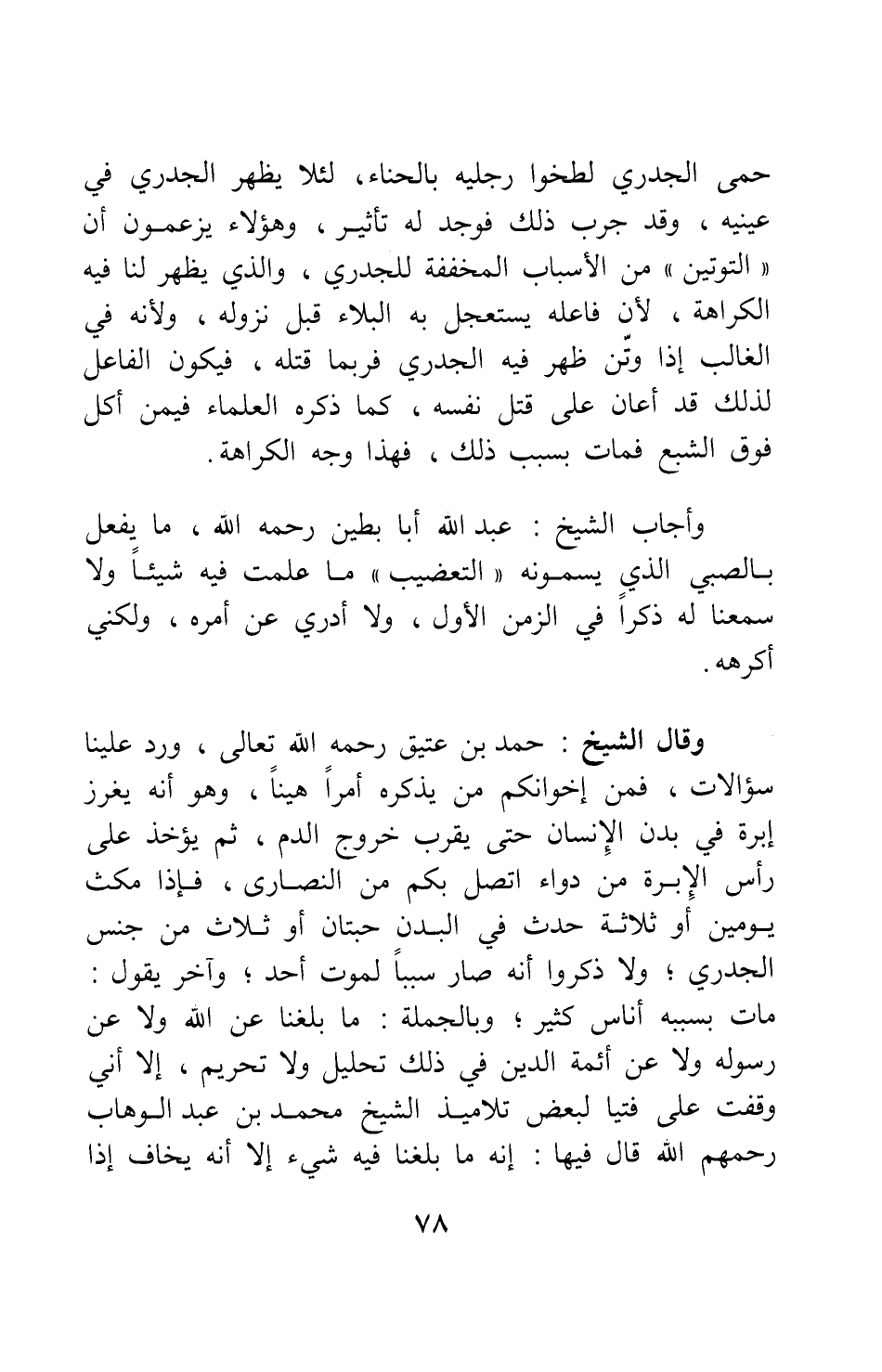 وقال الشيخ حمد بن عتيق، رحمه الله تعالى: ورد علينا سؤإلات، فمن إخوانكم من يذكره أمراً هيناً، وهو أنه يغرز إبرة في بدن الإنسان حتى يقرب خروج الدم، ثم يؤخذ على رأس الإبرة من دواء اتصل بكم من النصارى، فإذا مكث يومين أو ثلاثة حدث في البدن حبتان أو ثلاث من جنس الجدري، ولا ذكروا أنه صار سبباً لموت أحد; وآخر يقول: مات بسببه أناس كثير، وبالجملة، ما بلغنا عن الله ولا عن رسوله ولا عن أئمة الدين في ذلك تحليل ولا تحريم، إلا أني وقفت على فتيا لبعض تلاميذ الشيخ محمد بن عبد الوهاب، رحمهم الله، قال فيها: إنه ما بلغنا فيه شيء إلا أنه يخاف إذا