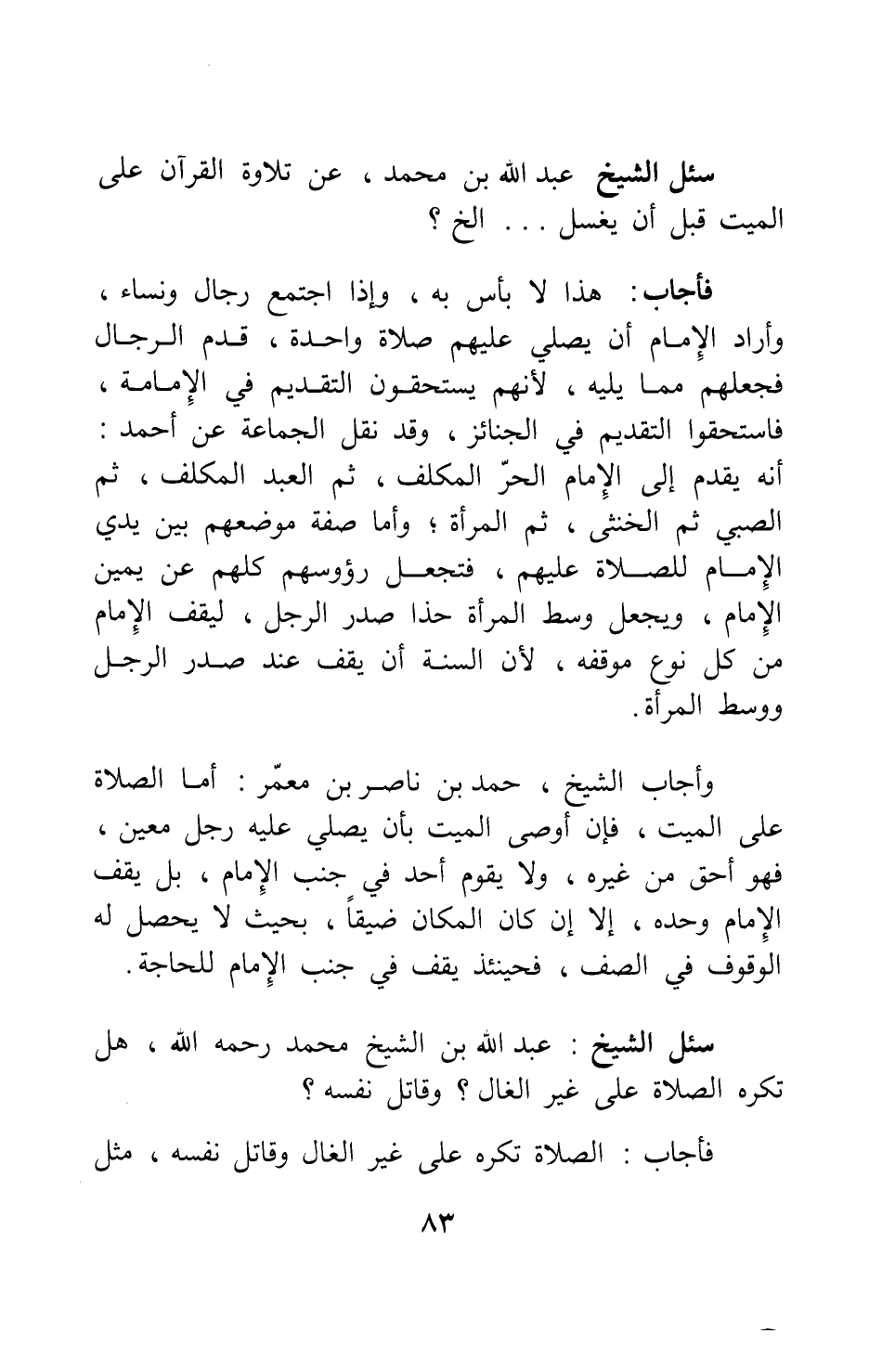 وأجاب الشيخ، حمد بن ناصر بن معمر: أما الصلاة على الميت، فإن أوصى الميت بأن يصلي عليه رجل معين، فهو أحق من غيره. ولا يقوم أحد في جنب الإمام، بل يقف الإمام وحده، إلا إن كان المكان ضيقاً، بحيث لا يحصل له الوقوف في الصف، فحينئذ يقف في جنب الإمام للحاجة.