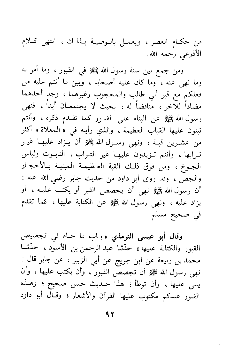 وقال أبو عيسى الترمذي: باب ما جاء في تجصيص القبور والكتابة عليها: حدثنا عبد الرحمن بن الأسود، حدثنا محمد بن ربيعة عن ابن جريج عن أبي الزبير عن جابر قال: " نهى رسول الله صلى الله عليه وسلم أن تجصص القبور، وأن يكتب عليها، وأن يبنى عليها، وأن توطأ " 2، هذا حديث حسن صحيح. وهذه القبور عندكم مكتوب عليها القرآن والأشعار، وقال أبو داود: