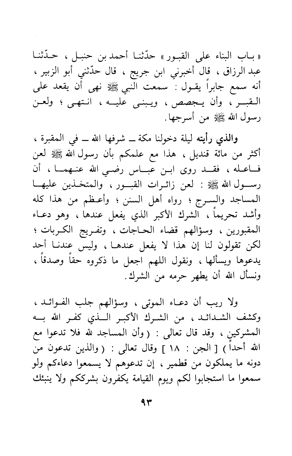 باب البناء على القبور: حدثنا أحمد بن حنبل، حدثنا عبد الرزاق، قال: أخبرني ابن جريج قال: حدثني أبو الزبير، أنه سمع جابراً يقول: " سمعت النبي صلى الله عليه وسلم نهى أن يقعد على القبر، وأن يجصص، ويبنى عليه " 1. انتهى. ولعن رسول الله صلى الله عليه وسلم من أسرجها؛ والذي رأيته ليلة دخولنا مكة - شرفها الله - في المقبرة، أكثر من مائة قنديل، هذا مع علمكم بأن رسول الله صلى الله عليه وسلم لعن فاعله، فقد روى ابن عباس، رضي الله عنهما، " أن رسول الله صلى الله عليه وسلم لعن زائرات القبور، والمتخذين عليها المساجد والسرج " 2، رواه أهل السنن. وأعظم من هذا كله وأشد تحريماً، الشرك الأكبر الذي يفعل عندها، وهو دعاء المقبورين، وسؤالهم قضاء الحاجات، وتفريج الكربات; لكن تقولون لنا: إن هذا لا يفعل عندها، وليس عندنا أحد يدعوها ويسألها، ونقول: اللهم اجعل ما ذكروه حقاً وصدقاً، ونسأل الله أن يطهر حرمه من الشرك.