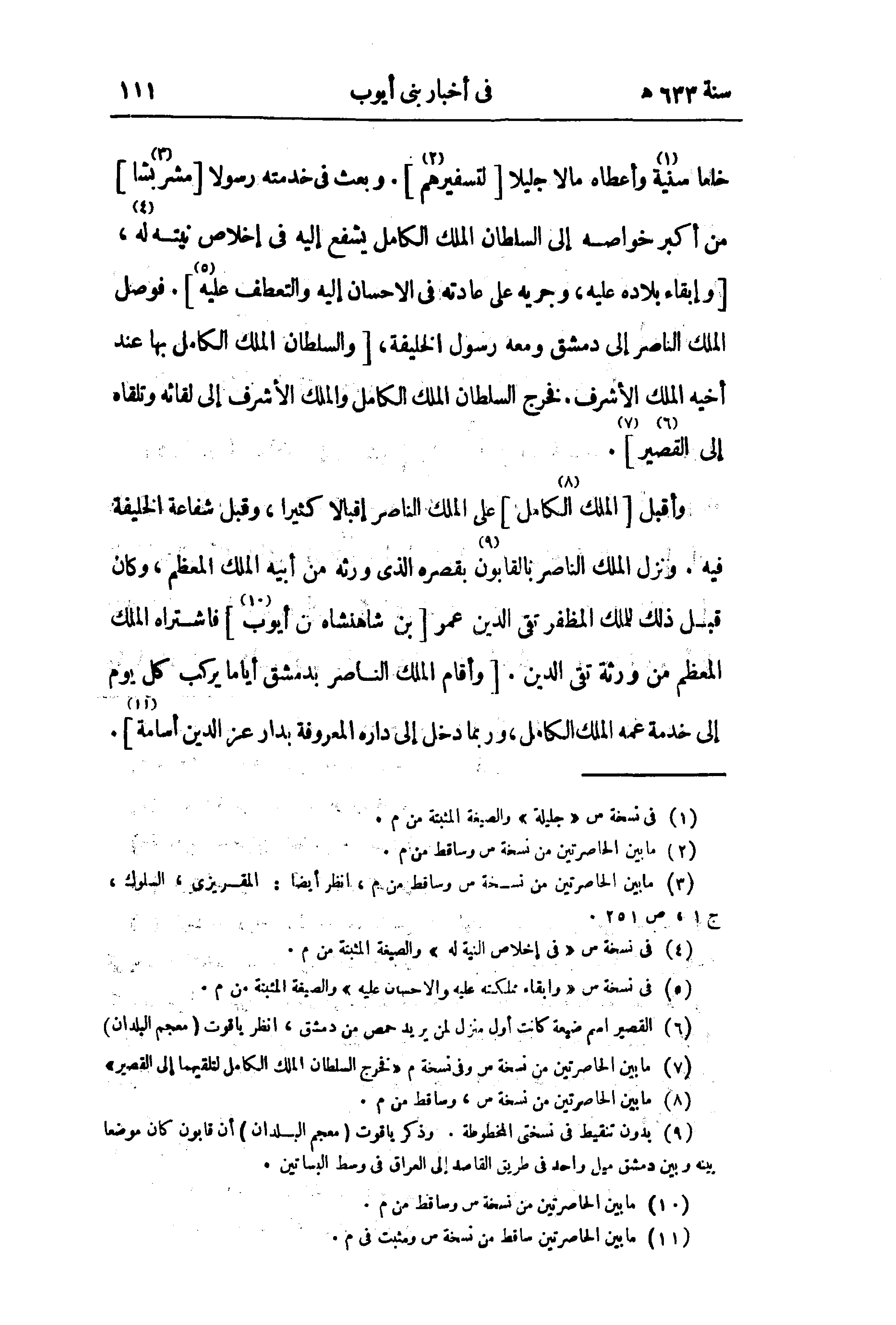 خلعا سنية (¬1) وأعطاه ما لا جليلا [لتسفيرهم (¬2)]. وبعث في خدمته رسولا [مشربشا (¬3)] من أكبر خواصه إلى السلطان الملك الكامل يشفع إليه في إخلاص نيته له (¬4)، [وإبقاء بلاده عليه، وجريه على عادته في الاحسان إليه والتعطف عليه (¬5)]. فوصل الملك الناصر إلى دمشق ومعه رسول الخليفة، [والسلطان الملك الكامل بها عند أخيه الملك الأشرف. فخرج السلطان الملك الكامل والملك الأشرف إلى لقائه وتلقاه إلى القصير (¬6)] (¬7).