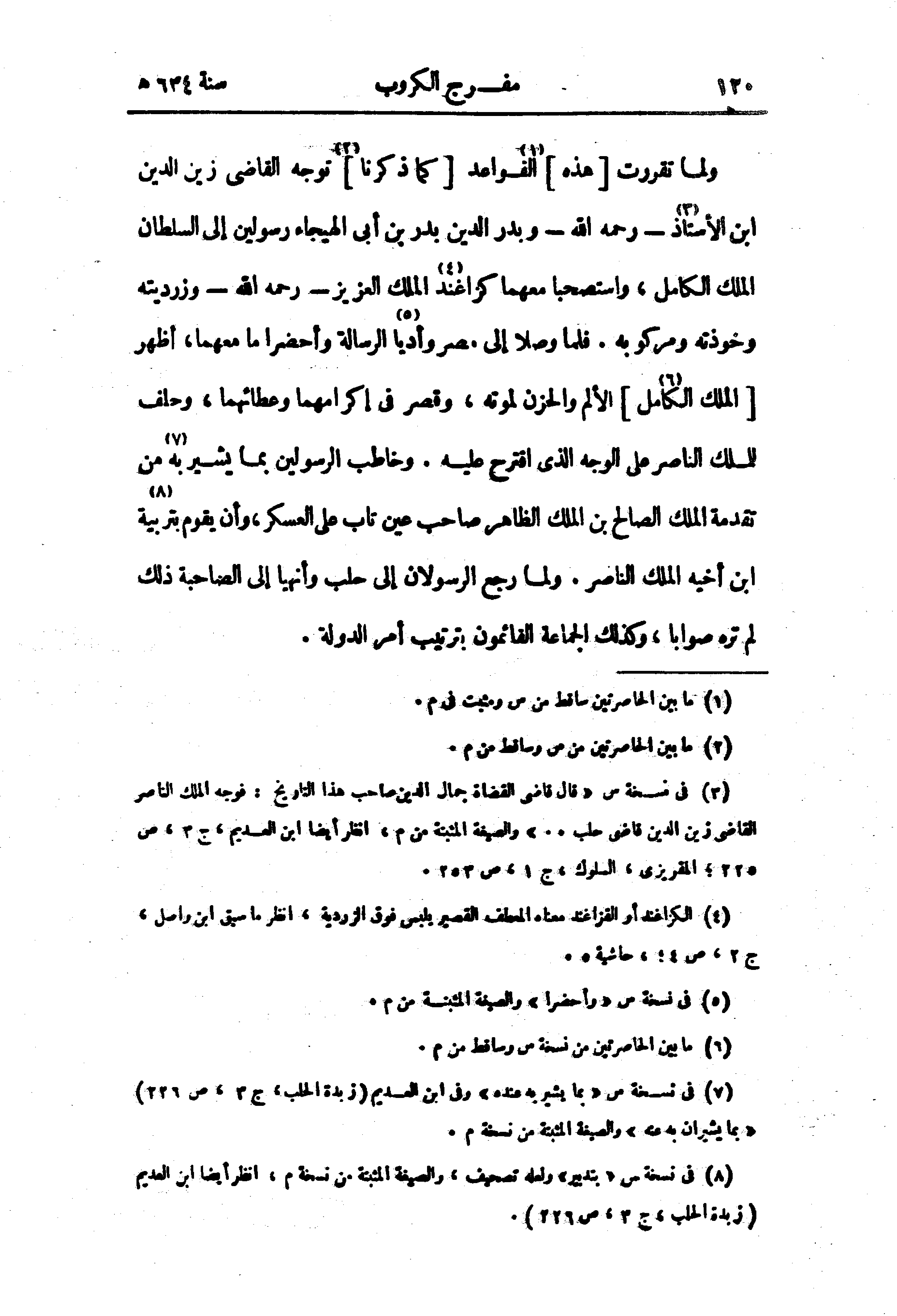 (¬3) في نسخة س «قال قاضى القضاة جمال الدين صاحب هذا التاريخ: فوجه الملك الناصر القاضى زين الدين قاضى حلب. .» والصيغة المثبتة من م، انظر أيضا ابن العديم، ج 3، ص 225؛ المقريزى، السلوك، ج 1، ص 253.
