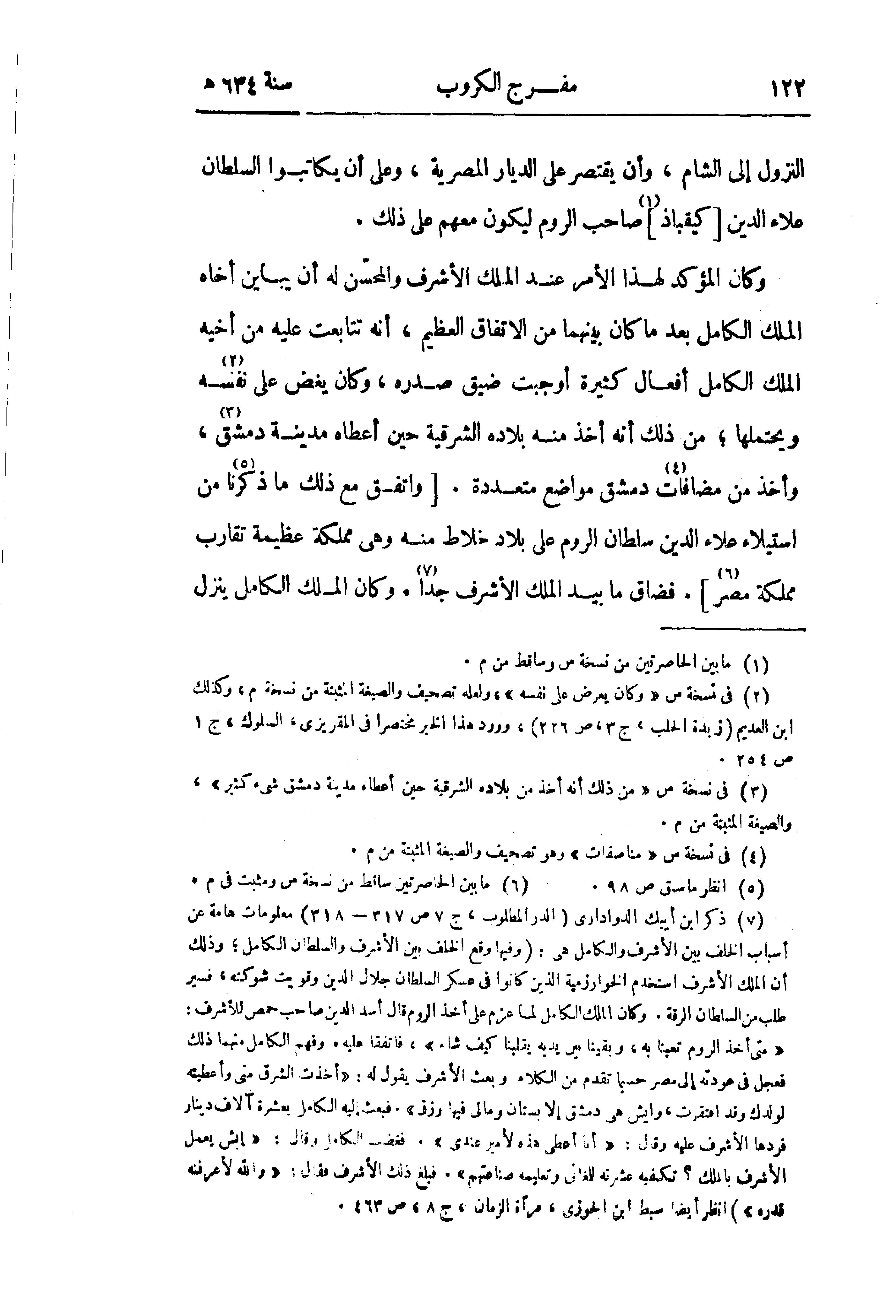 (¬7) ذكر ابن أيبك الدوادارى (الدر المطلوب، ج 7 ص 317 - 318) معلومات هامة عن أسباب الخلف بين الأشرف والكامل هى: (وفيها وقع الخلف بين الأشرف والسلطان الكامل؛ وذلك أن الملك الأشرف استخدم الخوارزمية الذين كانوا في عسكر السلطان جلال الدين وقويت شوكته، فسير طلب من السلطان الرقة. وكان الملك الكامل لما عزم على أخذ الروم قال أسد الدين صاحب حمص للأشرف: «متى أخذ الروم تعبنا به، وبقينا بين يديه يقلبنا كيف شاء»، فاتفقا عليه. وفهم الكامل منهما ذلك فعجل في عودته إلى مصر حسبما تقدم من الكلام وبعث الأشرف يقول له: «أخذت الشرق منى وأعطيته لولدك وقد افتقرت، وايش هى دمشق إلا بستان ومالى فيها رزق». فبعث إليه الكامل بعشرة آلاف دينار فردها الأشرف عليه وقال: «أنا أعطى هذه لأمير عندى». فغضب الكامل وقال: «إيش يعمل الأشرف بالملك؟ تكفيه عشرته للمغانى وتعليمه صناعتهم». فبلغ ذلك الأشرف فقال: «والله لأعرفنه قدره») انظر أيضا سبط ابن الجوزى، مرآة الزمان، ج 8، ص 463.