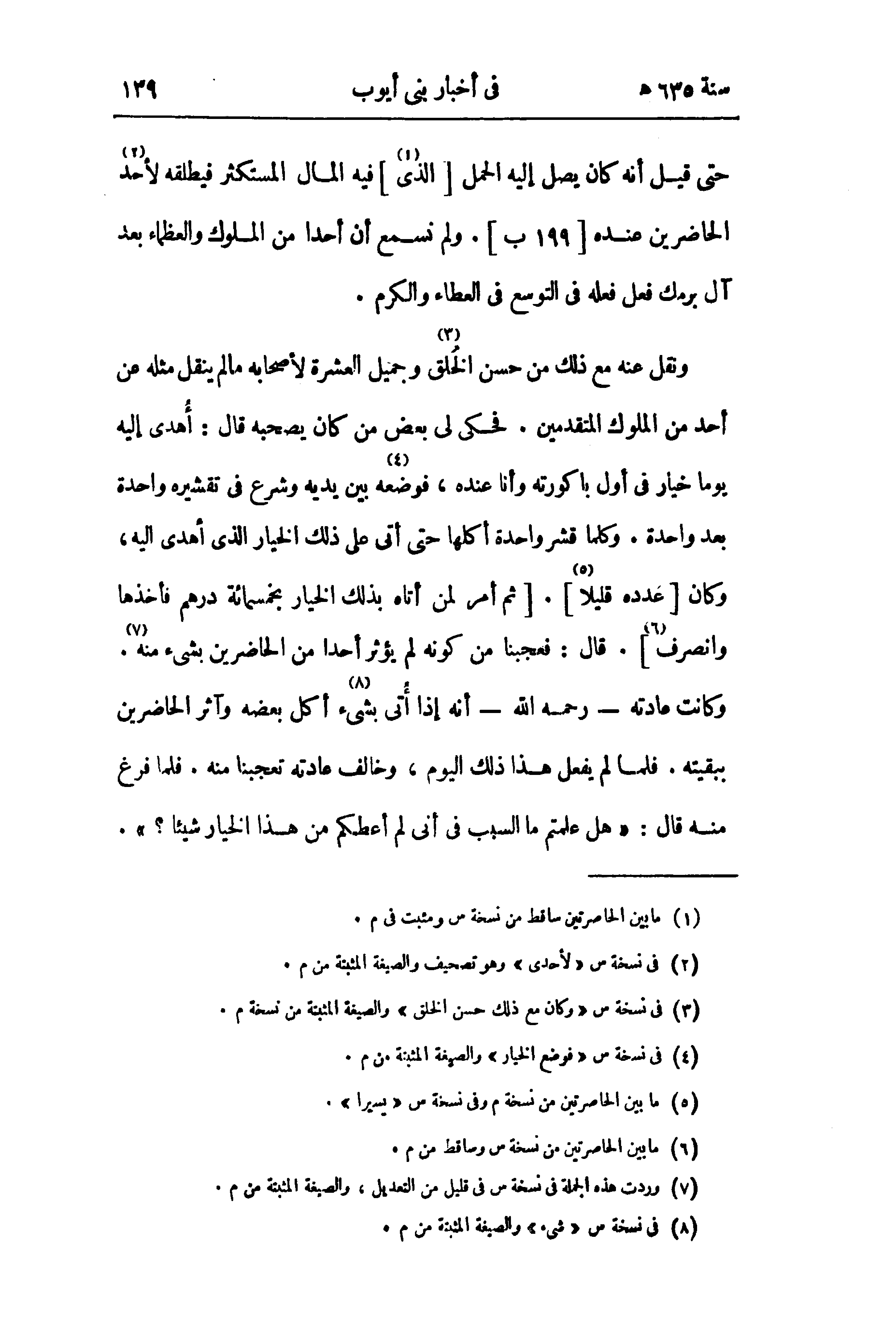 ونقل عنه مع ذلك من حسن الخلق (¬3) وجميل العشرة لأصحابه ما لم ينقل مثله عن أحد من الملوك المتقدمين. فحكى لى بعض من كان يصحبه قال: أهدى إليه يوما خيار في أول باكورته وأنا عنده، فوضعه (¬4) بين يديه وشرع في تقشيره واحدة بعد واحدة. وكلما قشر واحدة أكلها حتى أتى على ذلك الخيار الذى أهدى اليه، وكان [عدده قليلا (¬5)]. [ثم أمر لمن أتاه بذلك الخيار بخمسمائة درهم فأخذها وانصرف (¬6)]. قال: فعجبنا من كونه لم يؤثر أحدا من الحاضرين بشىء منه (¬7).