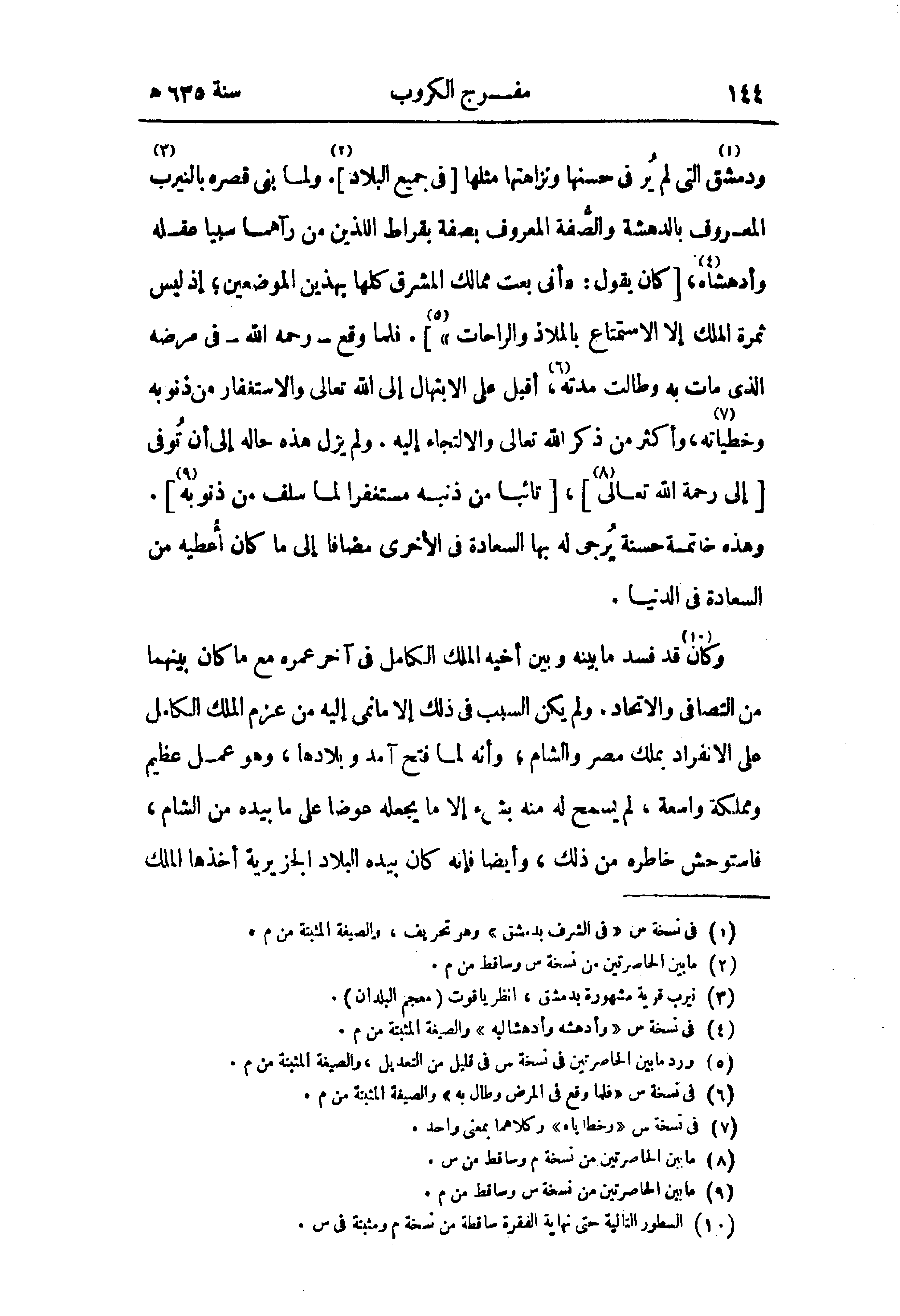 ودمشق (¬1) التي لم ير في حسنها ونزاهتها مثلها [في جميع البلاد] (¬2). ولما بنى قصره بالنيرب (¬3) المعروف بالدهشة والصّفة المعروف بصفة بقراط اللذين من رآهما سبيا عقله وأدهشاه (¬4)، [كان يقول: «أنى بعت ممالك المشرق كلها بهذين الموضعين؛ إذ ليس ثمرة الملك إلا الاستمتاع بالملاذ والراحات» (¬5)]. فلما وقع - رحمه الله - في مرضه الذى مات به وطالت مدته (¬6)، أقبل على الابتهال إلى الله تعالى والاستغفار من ذنوبه وخطياته (¬7)، وأكثر من ذكر الله تعالى والالتجاء إليه. ولم يزل هذه حاله إلى أن توفى [إلى رحمة الله تعالى (¬8)]، [تائبا من ذنبه مستغفرا لما سلف من ذنوبه (¬9)].